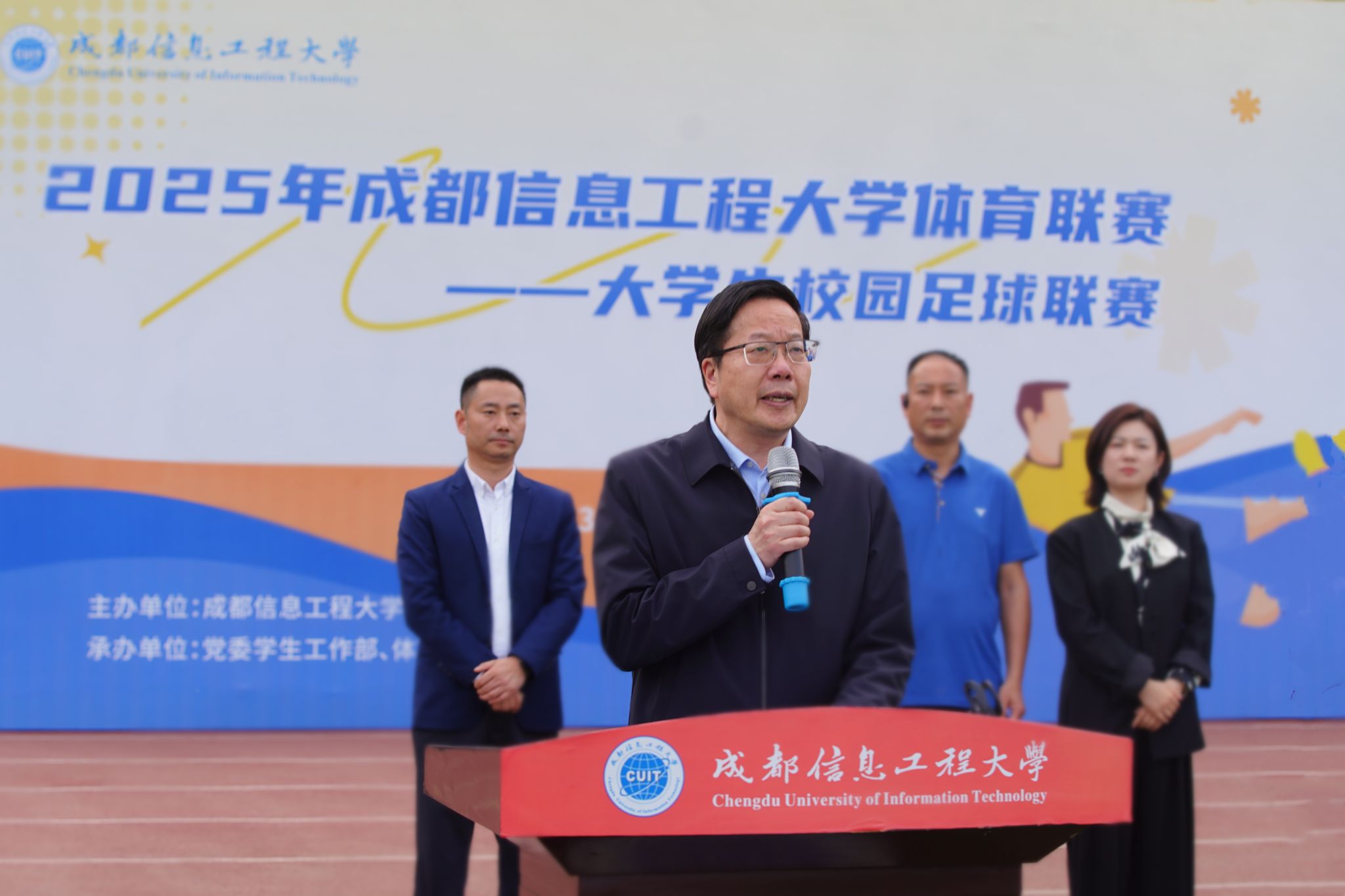 在庄严的国歌声中,五星红旗冉冉升起,正式拉开活动序幕。网络空间安全学院李修一同学代表全体运动员庄严宣誓,承诺恪守体育精神、严守竞赛规则;体育部杜町鹏老师率裁判团队宣誓,将以专业素养确保赛事公平公正。铿锵誓言彰显了成信大师生严谨务实的体育风范。