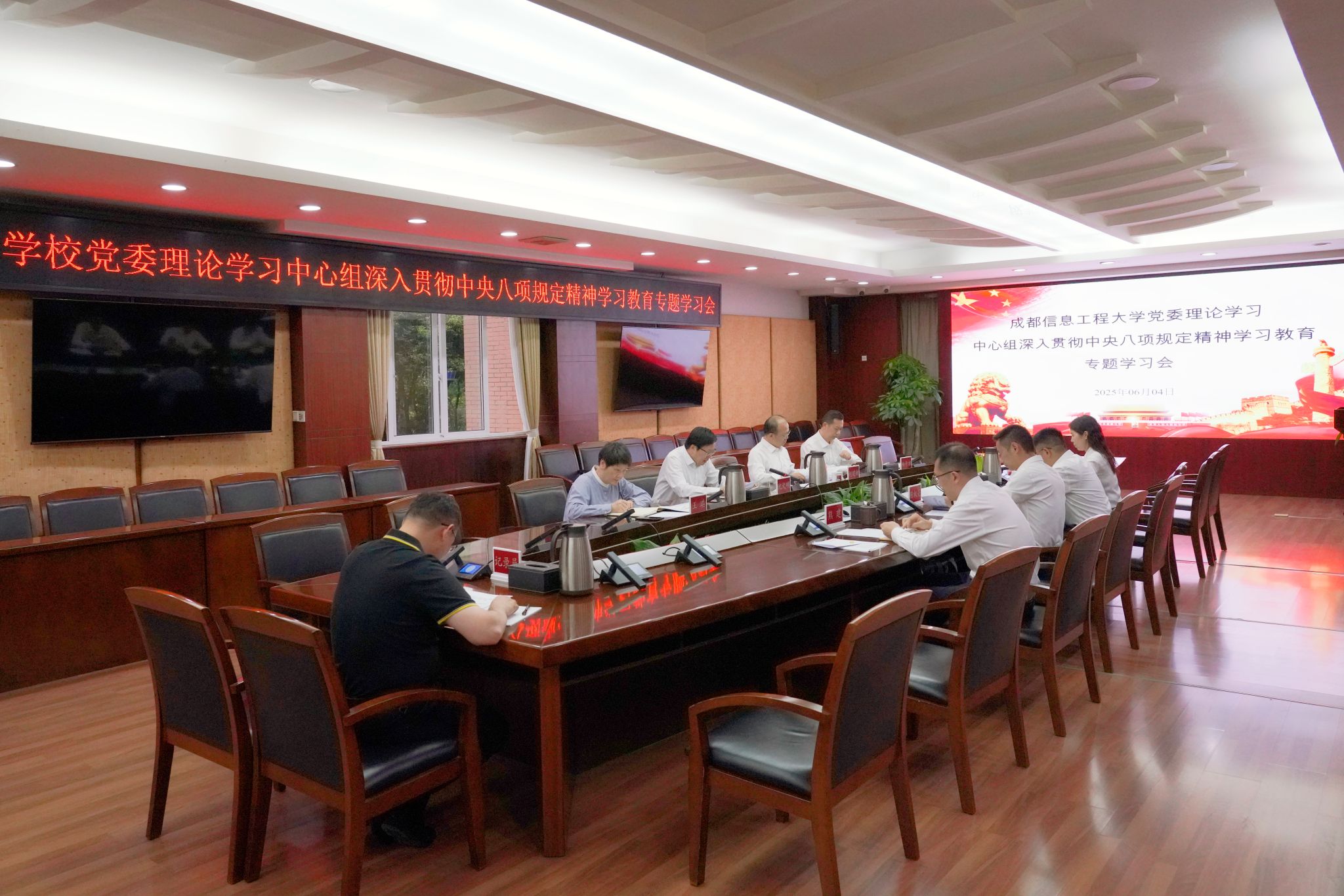 会议指出,违规吃喝是作风问题的典型表现,容易滋生腐败问题,侵蚀党的执政基础。要以案为鉴、以案促改,通过学习教育和通报警示举一反三、深挖病灶。各级党组织要扛牢政治责任,一把手要认真履行第一责任人,领导班子成员要严格落实“一岗双责”,把严的标准贯穿于教学科研、管理服务、教育监督全过程。广大党员干部要以身作则,在深入贯彻中央八项规定精神学习教育上带好头、做表率,绷紧纪律之弦,自觉抵制各种诱惑,做到心有所畏、言有所戒、行有所止,让中央八项规定精神在成信校园蔚然成风,成为护航学校新征程内涵式高质量发展的坚实保障。