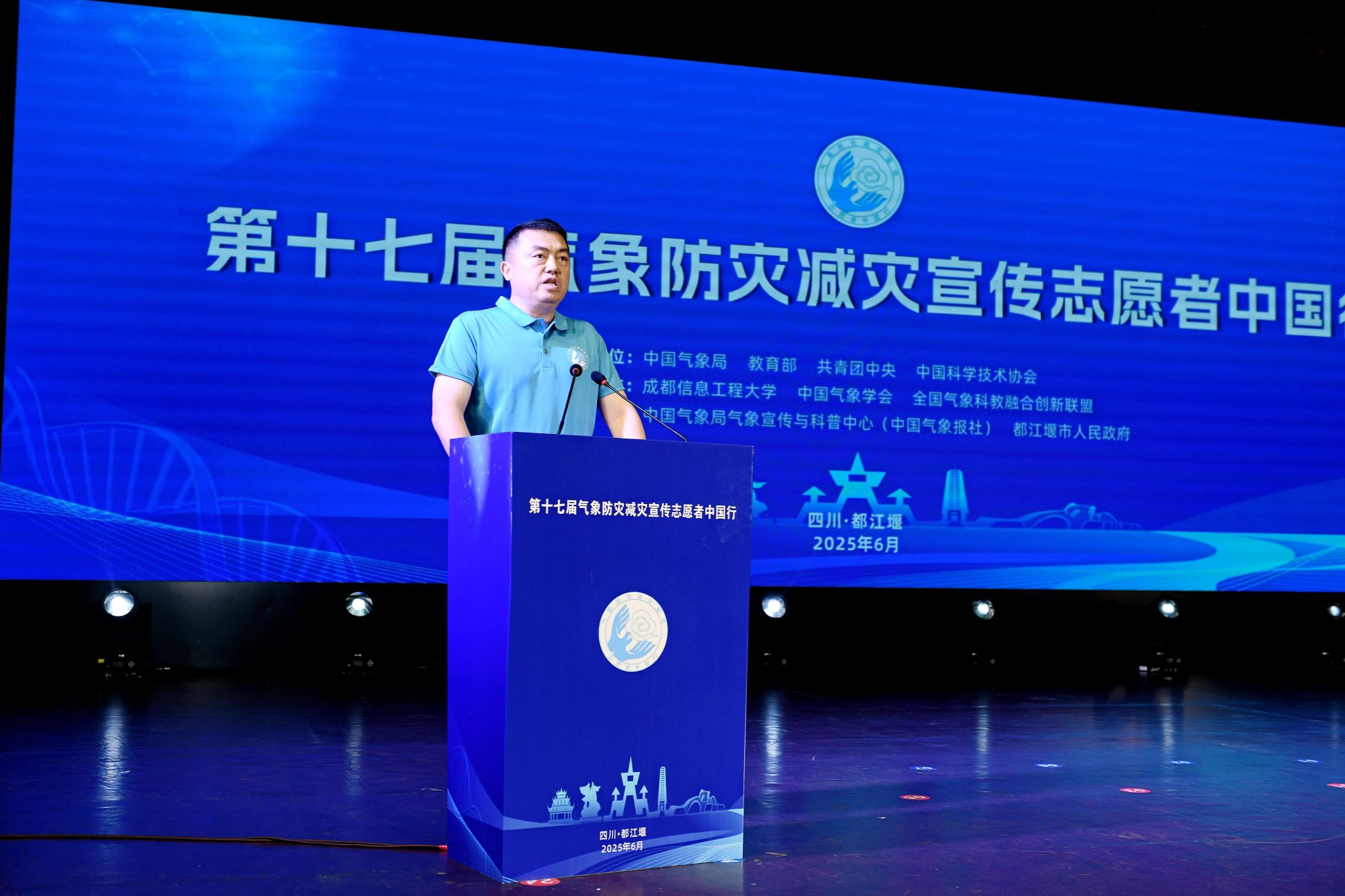 谭凌云代表都江堰市人民政府,向各位领导、嘉宾、志愿者朋友致以热烈欢迎。他表示,都江堰市深入贯彻习近平总书记重要指示精神,守好气象防灾减灾“第一道防线”,建成X波段气象雷达,“气象管家”等业务系统平台年均发送预警信息300万余条,连续八年获成都市气象服务先进集体。他感谢志愿者们为都江堰市提升公众气象防灾减灾救灾意识,助力提高都江堰市综合防灾能力所做的贡献。