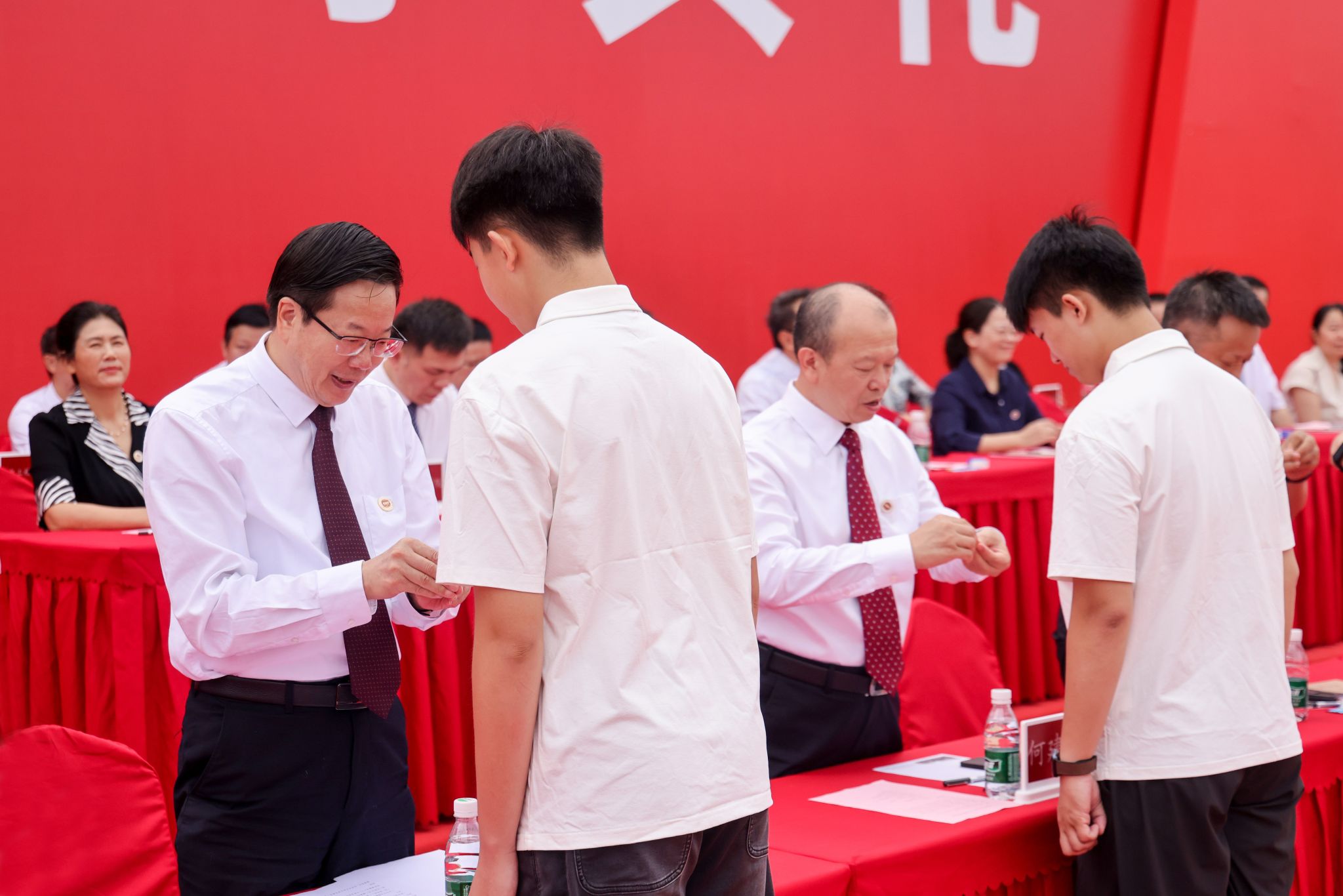 随后,主席台就座的领导和教师代表为新生代表佩戴九州登录校徽。这枚校徽不仅是“成信人”身份的象征,更是奉献青春力量,展现青年担当的使命传承。