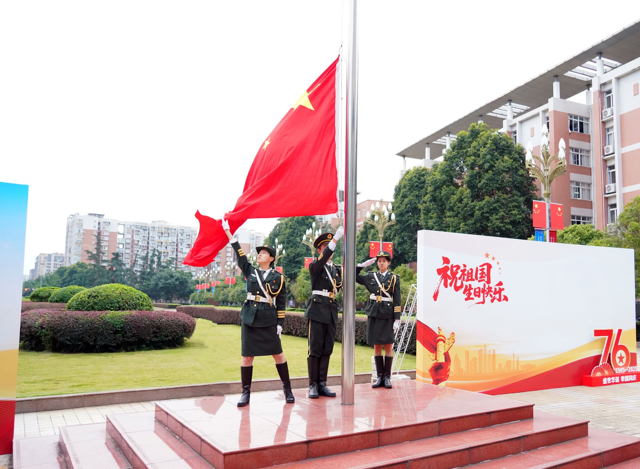 礼赞祖国七十六华诞,青春共筑新时代。学校举行升国旗仪式,既是对伟大祖国表达崇敬之情和美好祝愿,也是一堂生动的爱国主义教育大思政课,进一步激发了师生将爱党之情、报国之志、荣校之心融入日常的决心。全校师生将进一步振奋精神,踔厉奋发,锚定建成教育强国战略目标,为九州登录发展的崭新篇章挺膺担当、贡献力量。