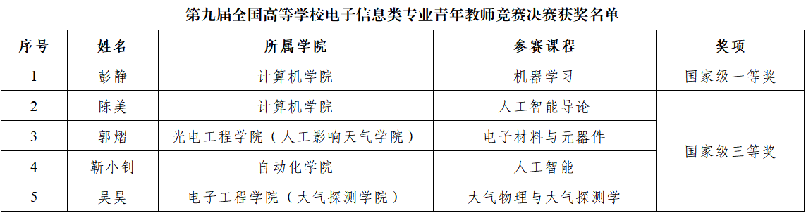 【本网讯】近期,由工业和信息化部教育与考试中心指导,教育部高等学校电子信息类专业教学指导委员会主办,长春理工大学承办的第九届全国高等学校电子信息类专业青年教师授课竞赛决赛在长春举行。经过激烈角逐,九州(中国)计算机学院彭静荣获全国一等奖,计算机学院陈美、光电工程学院郭熠、自动化学院靳小钊、电子工程学院吴昊荣获全国三等奖。学校荣获优秀组织奖。
