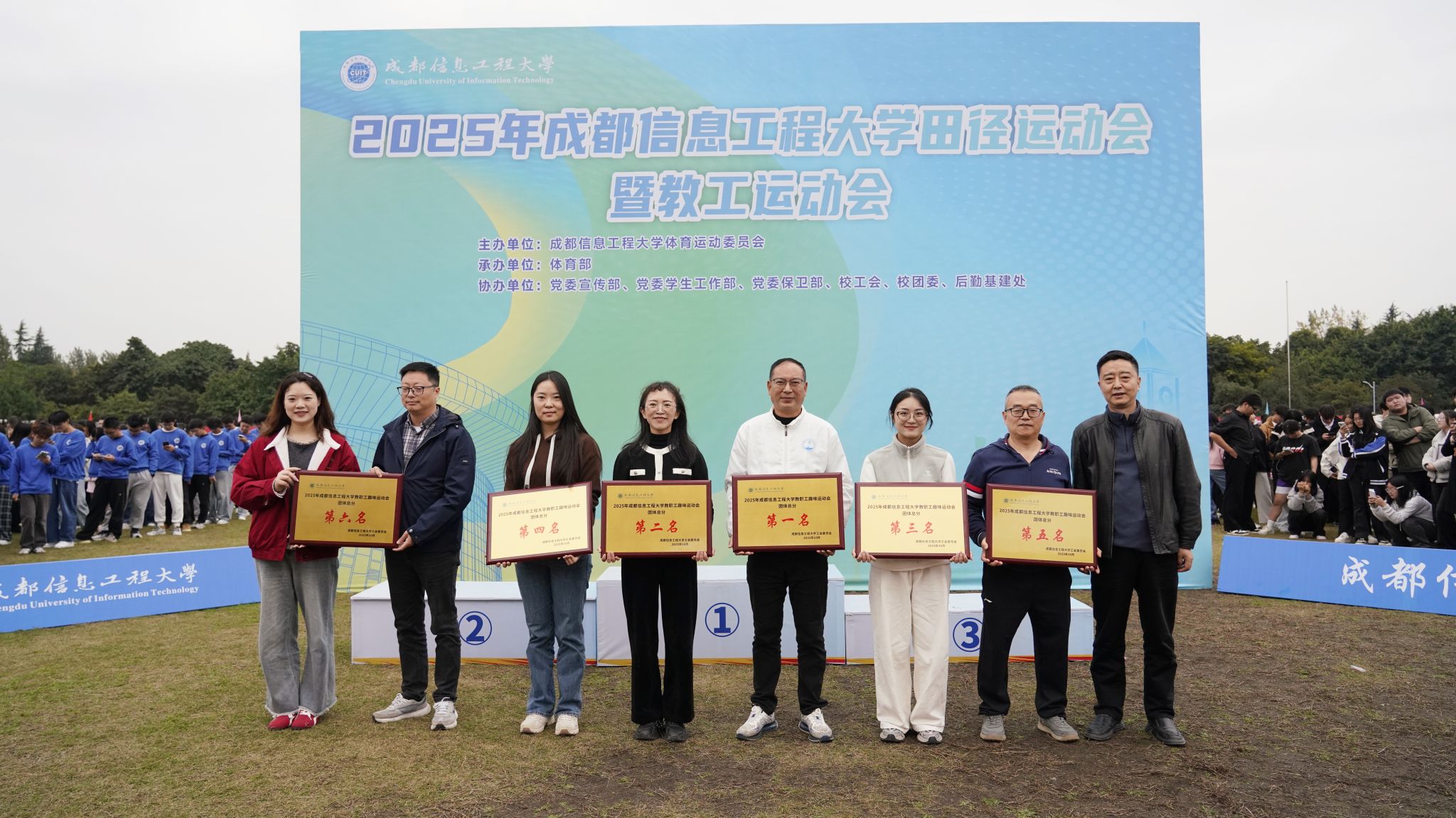 为教职工趣味运动会团体前六名获奖单位颁奖