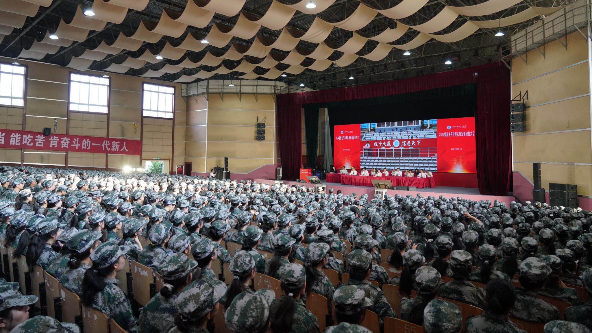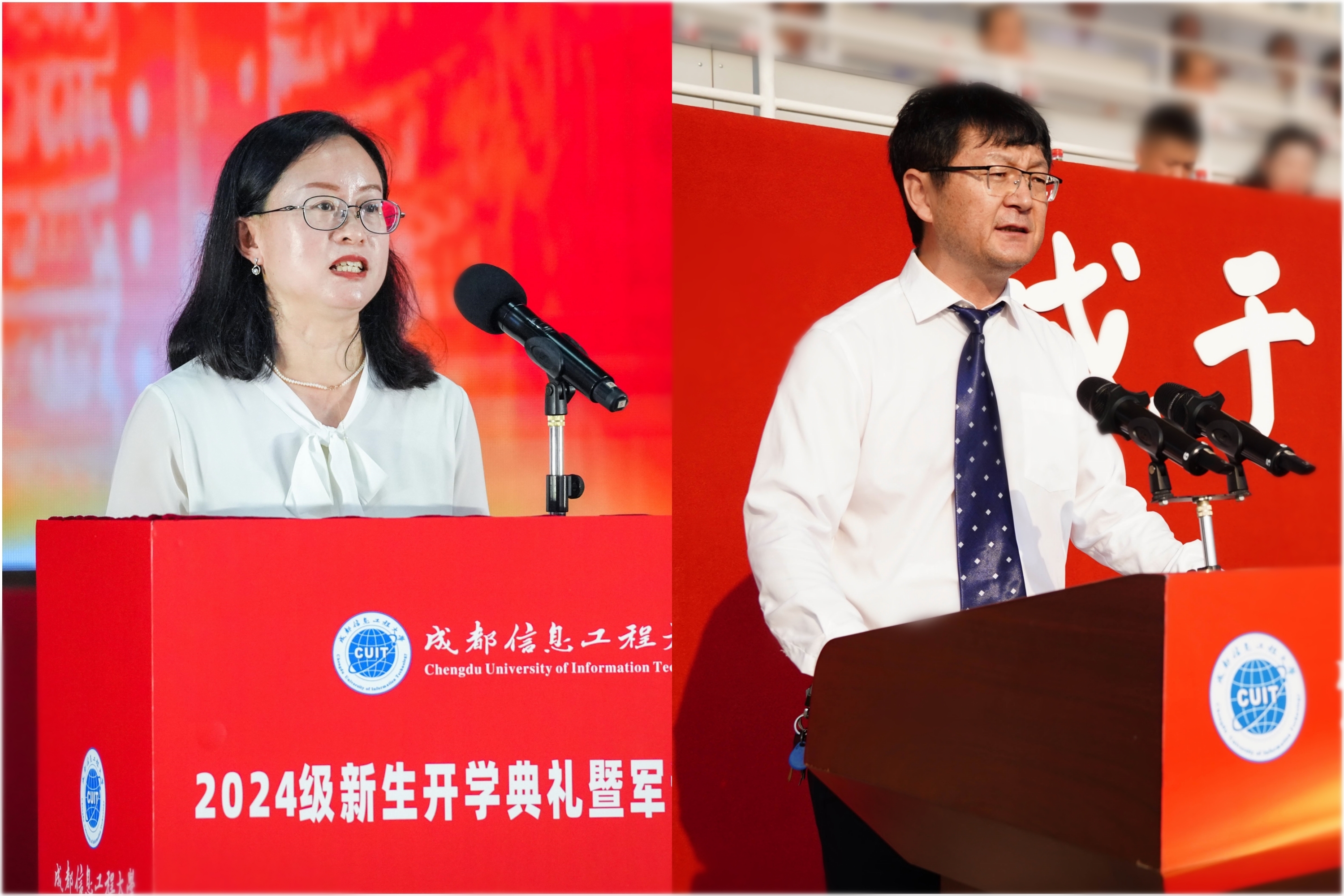 【本网讯】长空旭日蓄势待发,成信学子昂扬振奋。9月2日清晨,学校2024级新生开学典礼暨军训动员大会在航空港校区第二田径场和龙泉校区大礼堂盛大举行。大会现场两校区活动盛况网络同步直播。学校领导,相关职能部门负责人,各学院党委书记(副书记)、院长,2024级学生辅导员,2024级全体学生参加典礼。学校副校长陈权亮主持开学典礼。