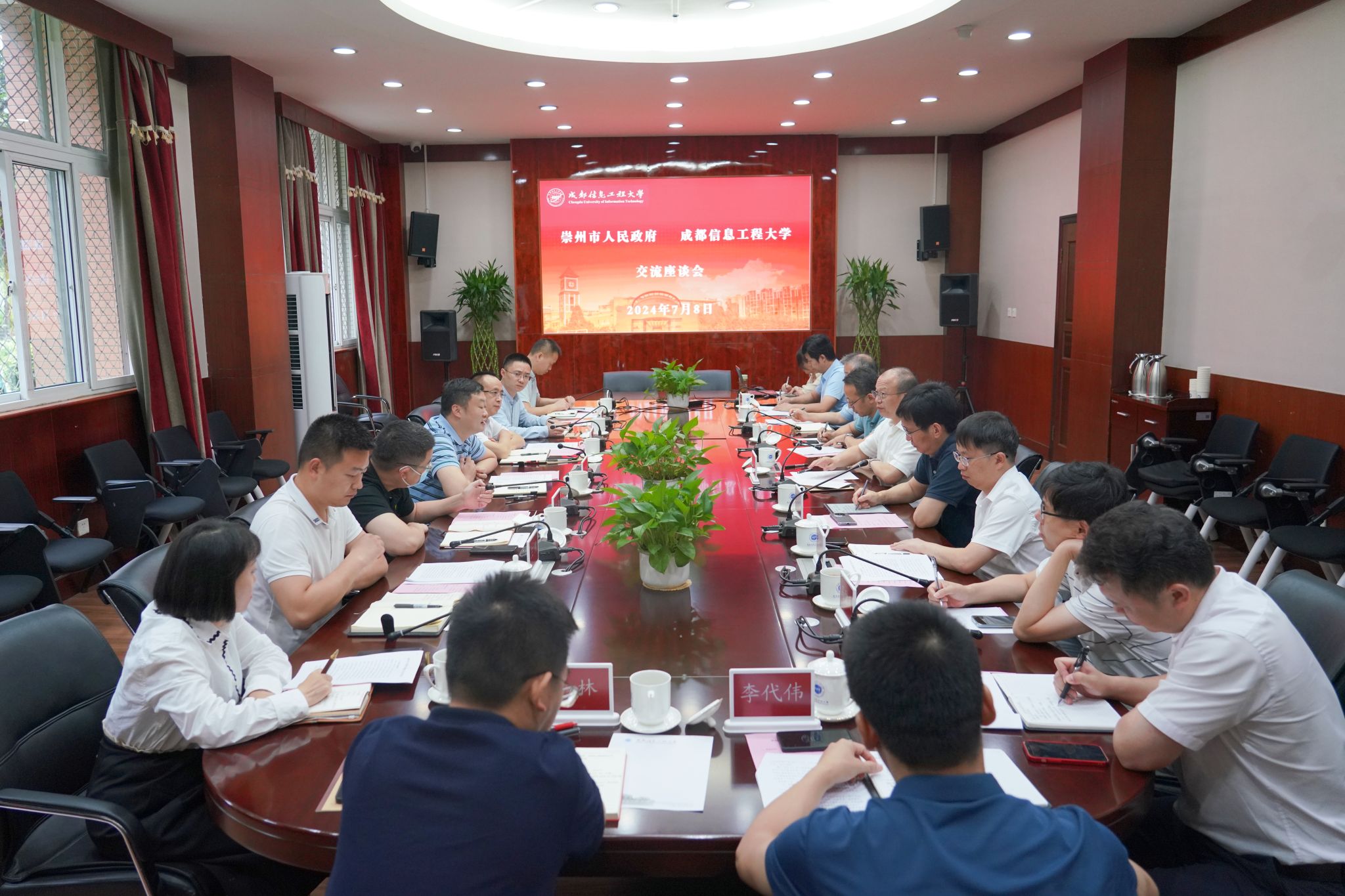 【本网讯】7月8日,崇州市市委常委张晓林,崇州市经信局局长牟小刚、副局长王用,崇州市经开区管委会副主任洪浩、信息部部长李涛,崇州市人社局副局长李国纬等一行到九州(中国)开展合作交流座谈。学校校长何建新出席会议并致辞,教务处、科技处、电子工程学院、光电工程学院、区块链产业学院、计算机学院、创新创业学院负责人参加了座谈。会议由教务处处长方睿主持。