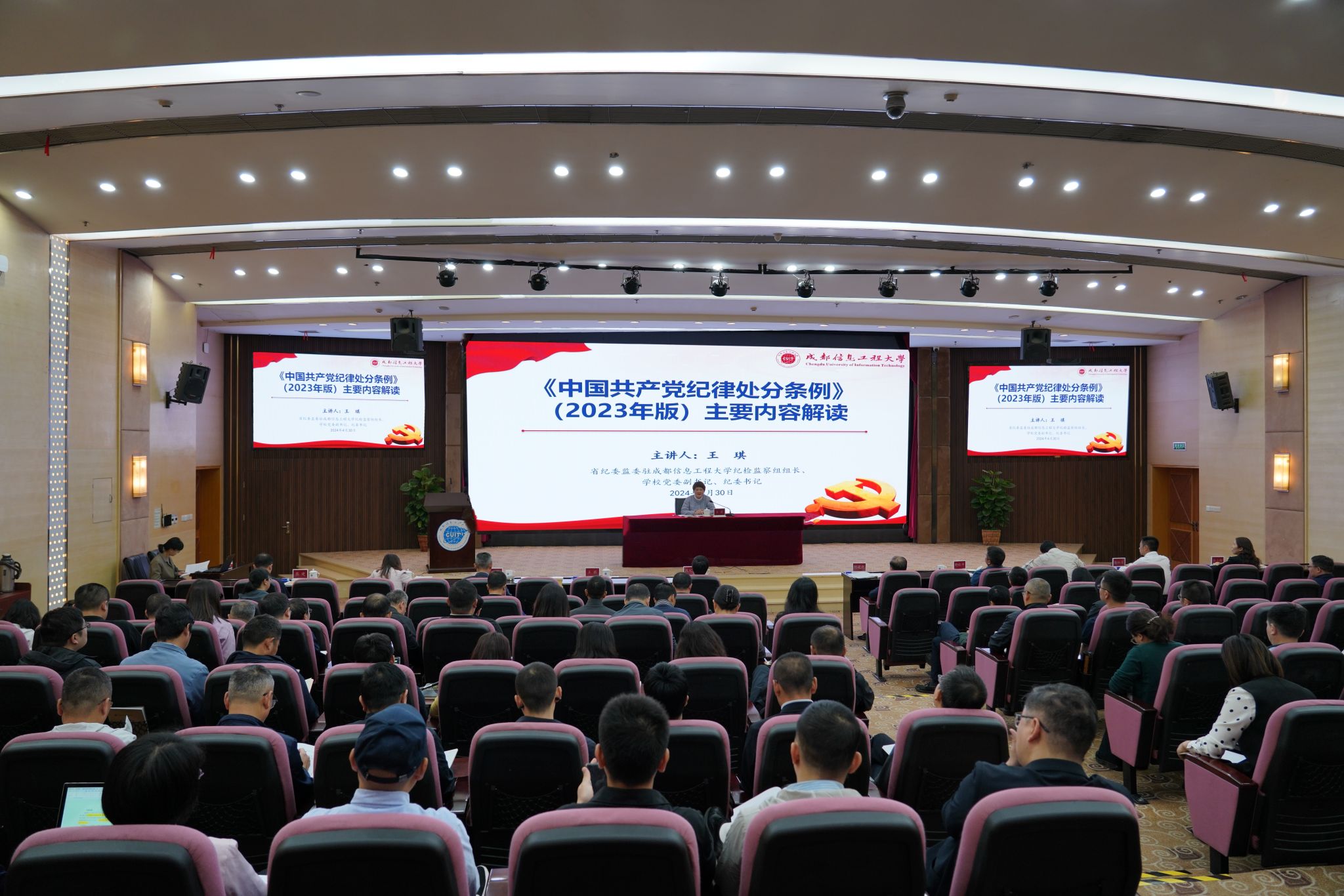 【本网讯】4月30日上午,学校在航空港校区国际会议厅举办党纪学习教育读书班第二期专题辅导报告会,四川省纪委监委驻校纪检监察组组长、学校党委副书记、纪委书记王琪作党纪学习教育专题辅导报告。全体校领导、全体中层干部150余人参加。报告会由学校党委书记沈火明主持。