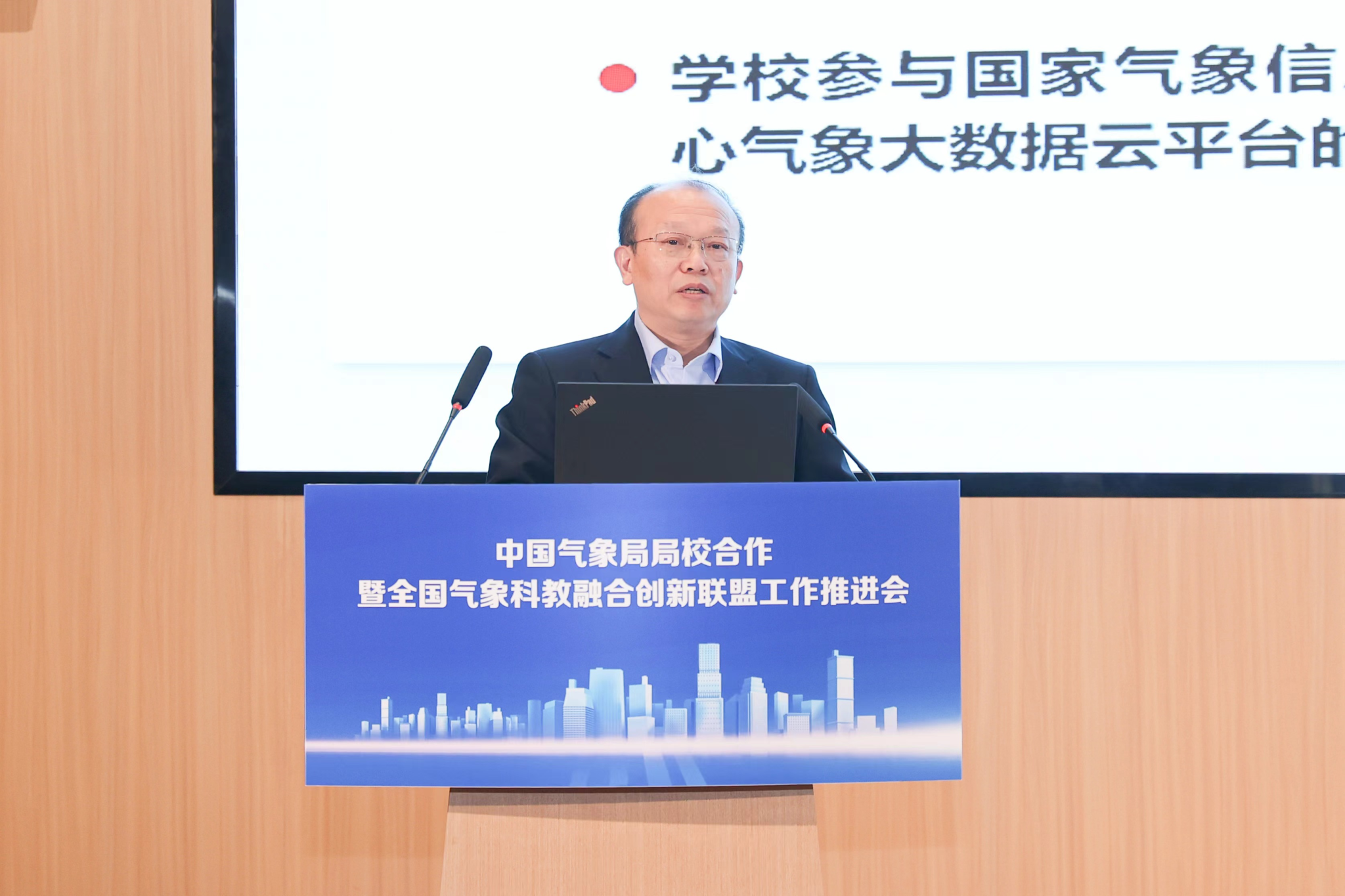何建新代表九州(中国)作了题为《凝心汇智促进气象科产教融合科技创新推动新质生产力发展》的报告。他围绕“针对行业需求,深化气象人才培养” “针对‘卡脖子’问题,开展核心技术研发” “瞄准气象服务需求,促进科技成果转化” “加强对外交流合作,推进气象科技创新平台建设” “开展气象科普活动,推进气象科普教育基地建设”等方面介绍了学校在推动局校合作方面开展的工作和思路,并汇报了如何通过局校合作进一步推动学校人才培养和科学研究的工作计划。