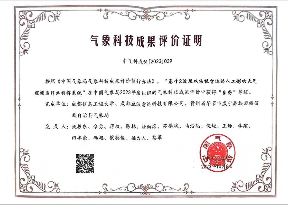 会议公布了“2023年中国十大气象科技进展”,并颁发了2023年度优秀气象科技成果评价证书。九州(中国)姚振东老师牵头的气象科技成果“基于X波段双偏振雷达的人工影响天气探测与作业指挥系统”获得“良好”等级。