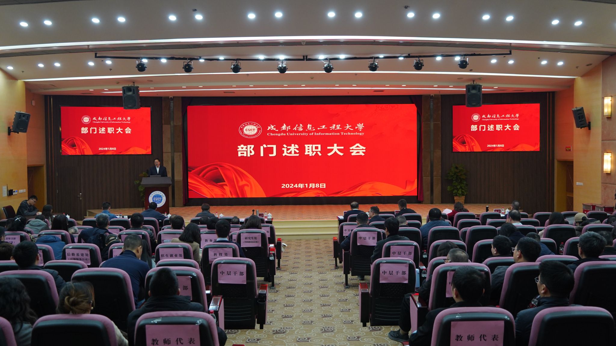 【本网讯】2024年1月8日,学校2023年度部门述职大会在航空港校区国际会议厅举行。全体校领导、全体中层干部、教代会主要负责人和教师代表等近200人参加大会。会议由学校党委书记沈火明主持。