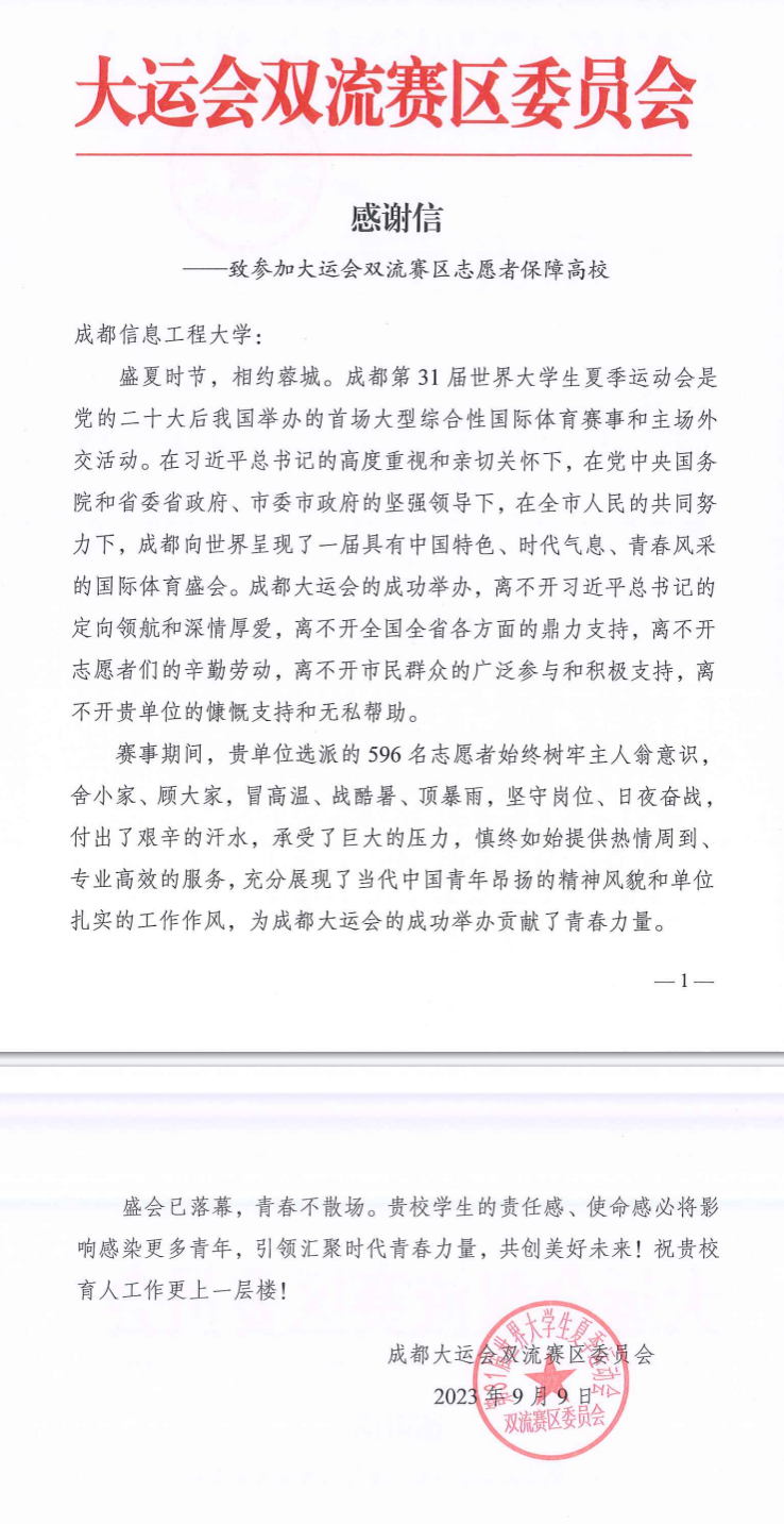 来源:党委办公室 校长办公室 作者:成都大运会双流赛区委员会日期:2023-09-27 审核:新闻中心 点击: