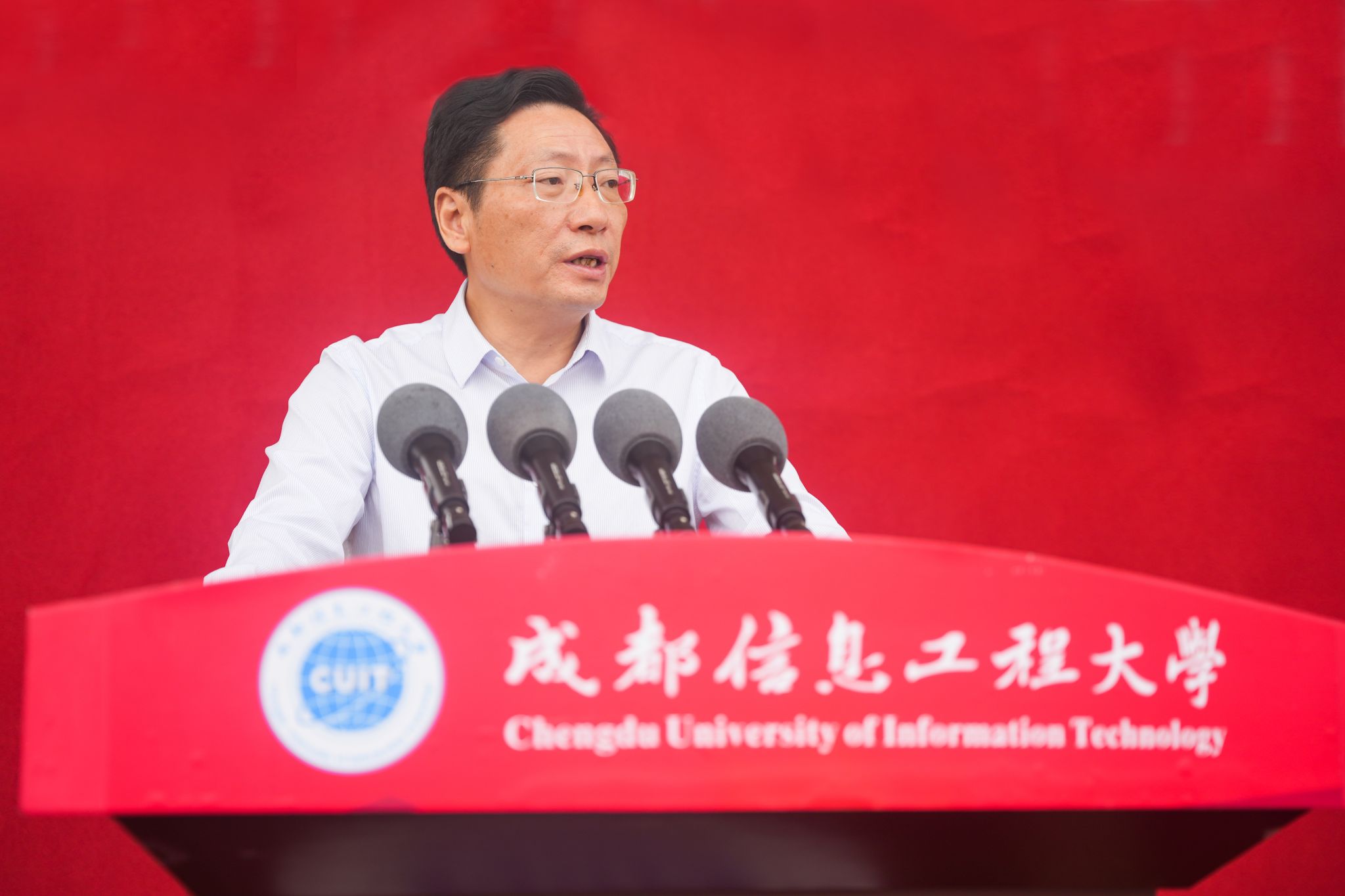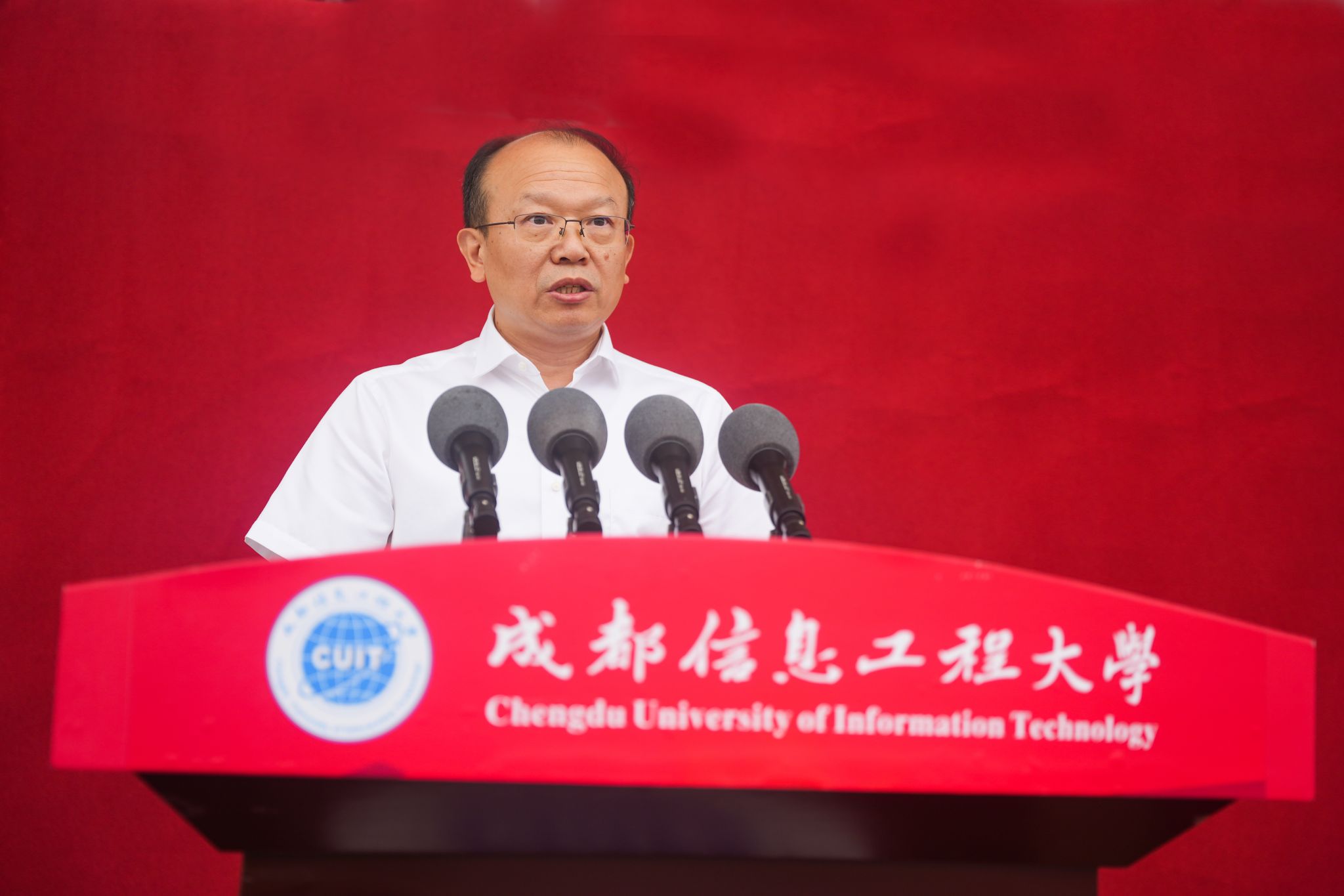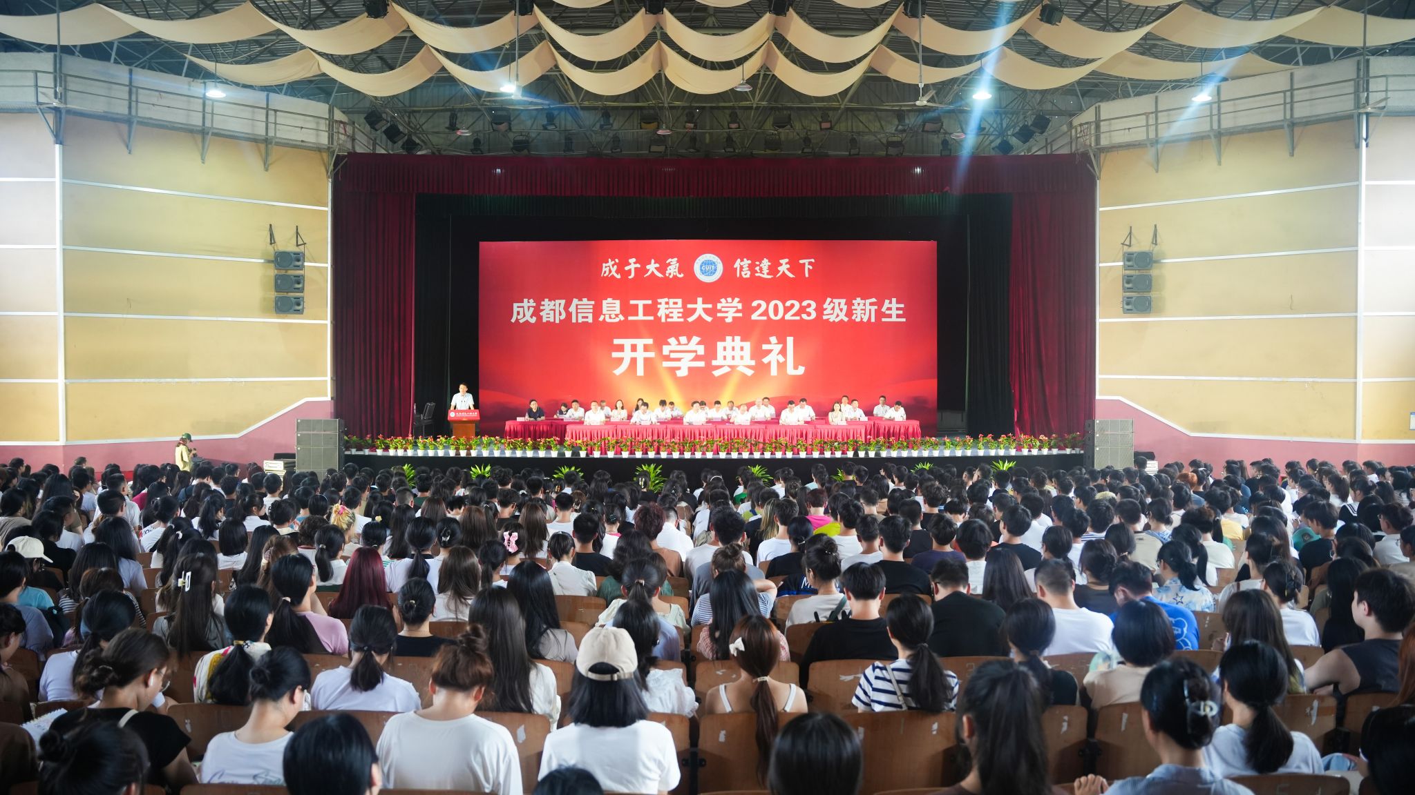 学校校长何建新作了题为《尊师 好学 励志 笃行 做真才实干的成信人》的新生寄语讲话,他希望同学们在美好的校园里,强健体魄、收获知识、磨砺品格、茁壮成长;在大学里找到自己的兴趣和热爱,并坚持下去,把个人梦想融入到国家事业中;发扬成信精神,历炼海纳百川、拼搏进取的大气品质,塑造诚实守信、通达天下的高尚人格,践行“尊师、好学、励志、笃行”的优良学风,争做真才实干的成信人!