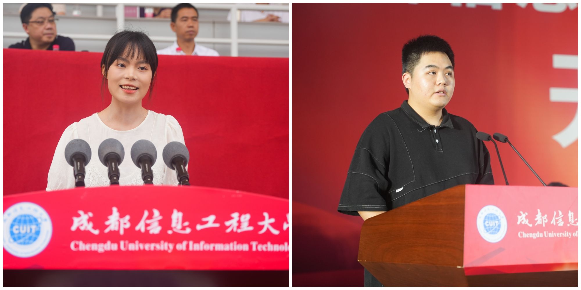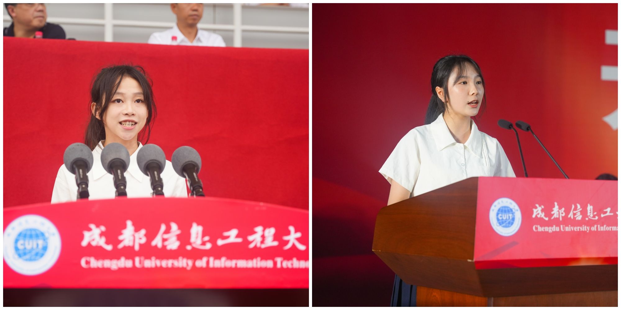 来自计算机学院计算机科学与技术专业的李香春和统计学院国际经济与贸易专业李霞霖同学分别代表2023级新生发言。他们号召新生要赓续学校红色血脉、勇担强国使命,以成信前辈先贤为坐标,以优秀学长学姐们为榜样,牢记领导、老师和父母的殷切嘱托,积极融入和适应大学生活,树立远大的理想志向,珍惜时光,全面提高个人综合素质和专业素养,丰富知识,完善自我。