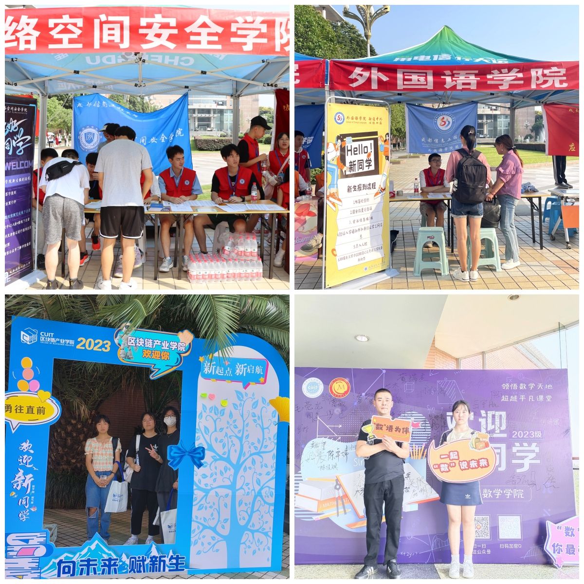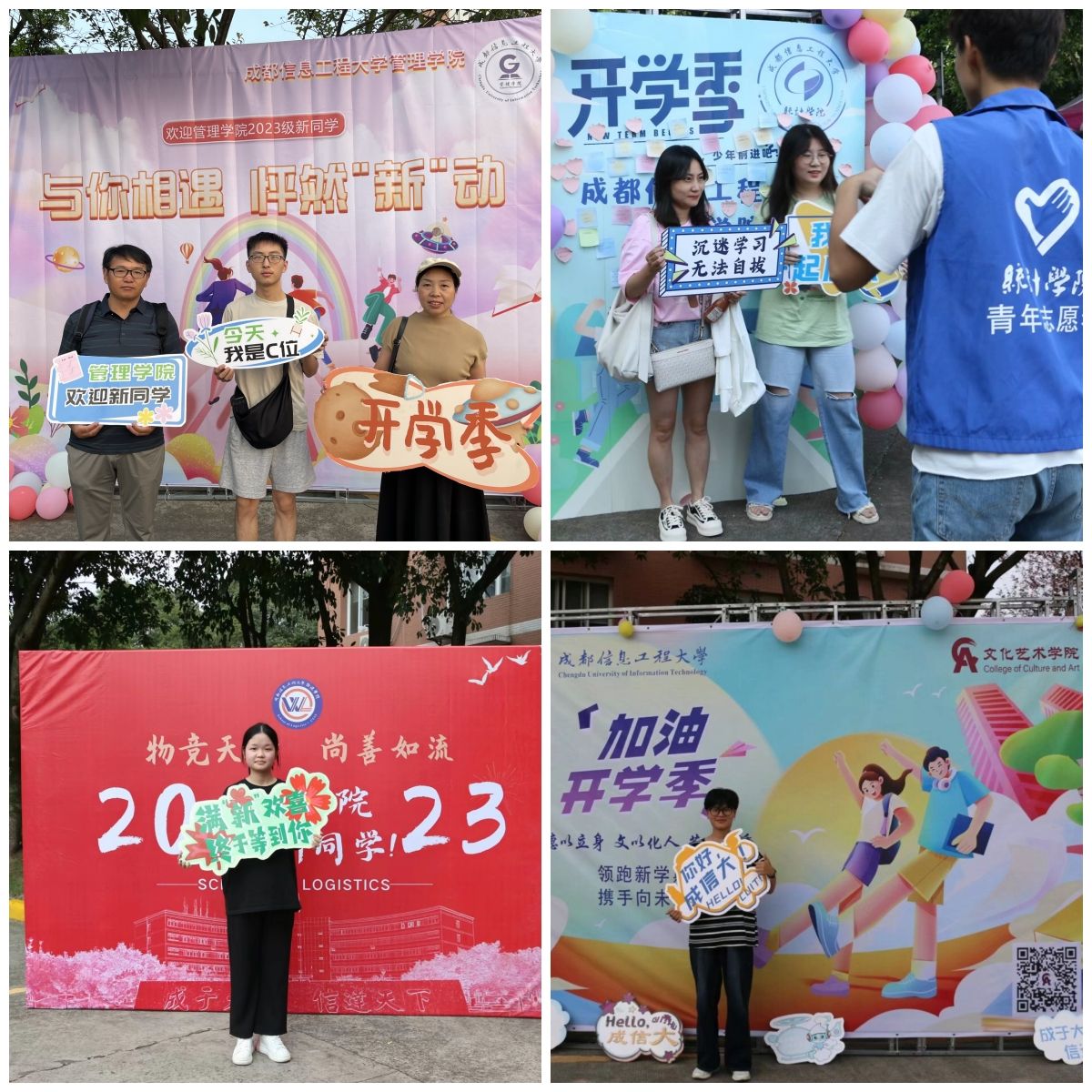 各学院为了迎接新成员用心安排布置了喜庆精美的合影墙、党员志愿服务、实验室作品展示、欢迎标语、吉祥物、签名板等学科特色鲜明、文化韵味十足的“见面礼”,让2023级同学的新起点、新面貌被共同见证和温馨定格。
