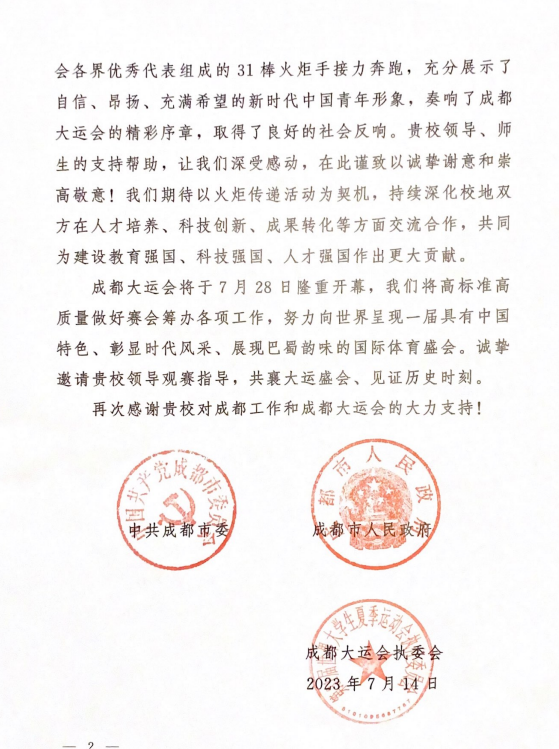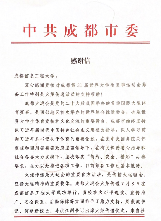 【本网讯】近日,学校收到中共成都市委、成都市人民政府成都大运会执委会发来的感谢信。感谢学校对成都第31届世界大学生夏季运动会筹备工作特别是火炬传递活动的支持与帮助。