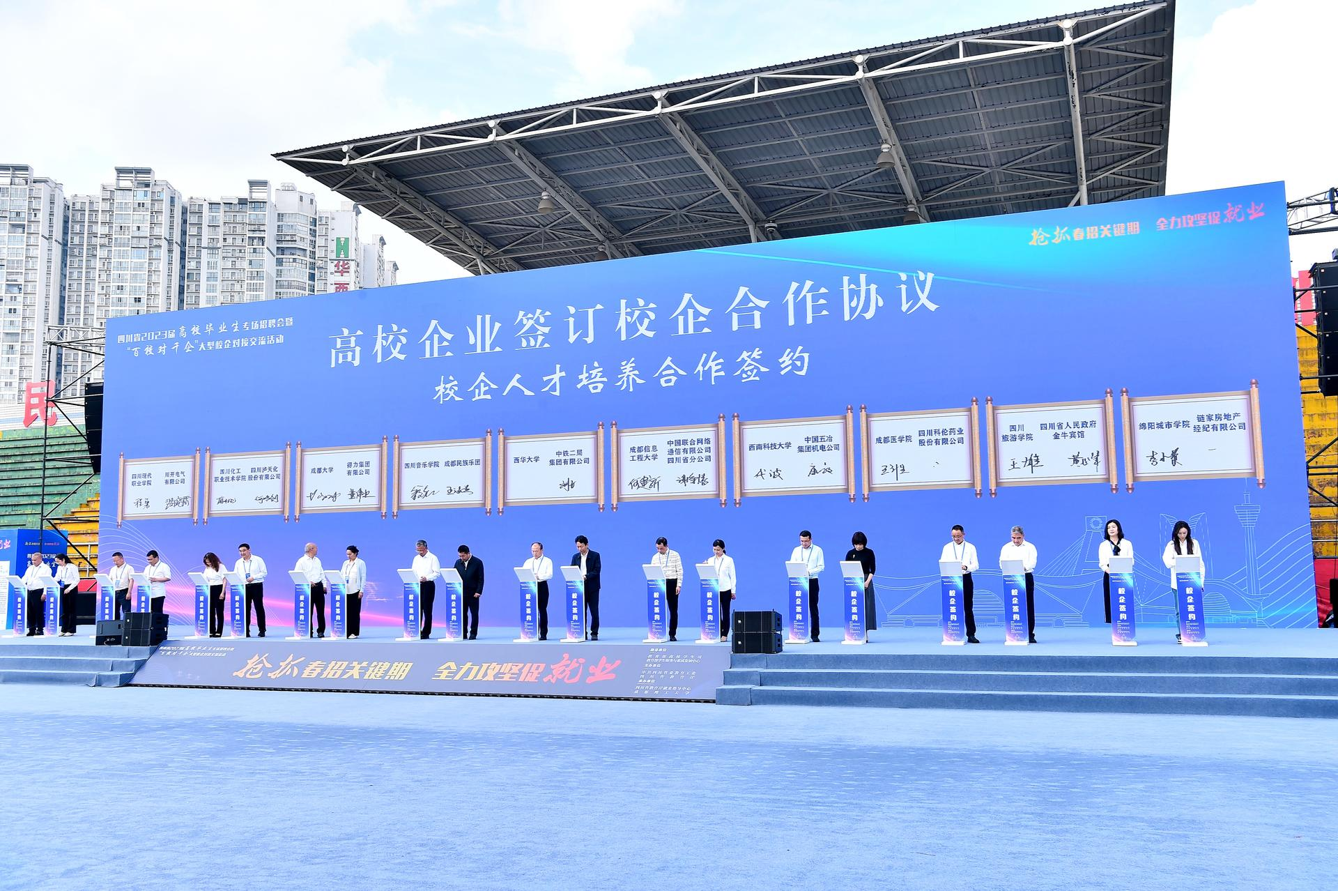 何建新与中国联合网络通信有限公司四川省分公司人力资源部副总经理谢争涛代表双方单位签订校企合作协议。招生就业处、通信工程学院(微电子学院)负责人在校企对接交流活动现场积极走访用人单位、拓展就业市场;学校百余名未就业毕业生参加本次专场招聘活动,学生积极投递简历,取得预期收获。