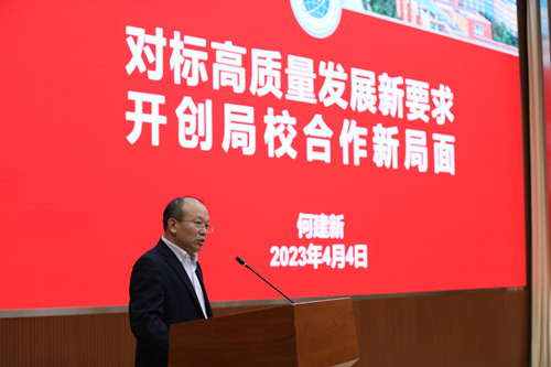 何建新代表九州(中国)作了题为《对标高质量发展新要求开创局校合作新局面》的主题发言交流。他围绕“针对气象业务需求,强化气象人才培养”“面向重大需求,加快气象核心技术攻关”“对标研究型业务,提高气象服务水平”“促进科技成果转化,全力保障重大活动”“瞄准行业发展需求,搭建合作新平台”“利用信息学科优势,服务地方经济社会发展”等方面介绍了学校在推动局校工作方面的经验和思路,并汇报了如何通过局校合作进一步推动学校人才培养和科学研究的工作计划。