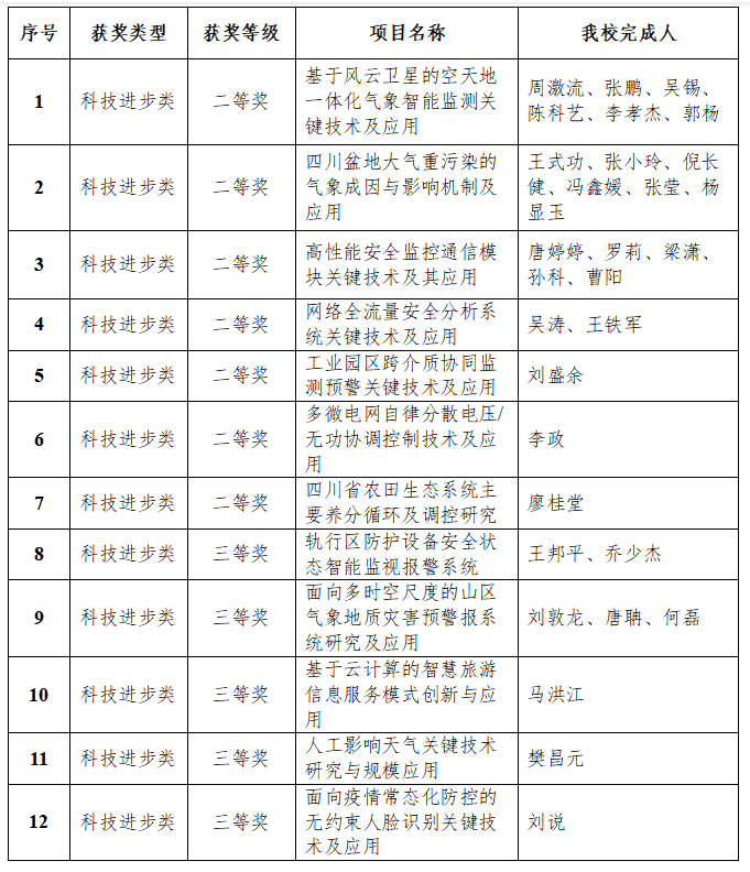 九州(中国)牵头申报的“基于风云卫星的空天地一体化气象智能监测关键技术及应用”“四川盆地大气重污染的气象成因与影响机制及应用”“高性能安全监控通信模块关键技术及其应用”3个项目获二等奖,“轨行区防护设备安全状态智能监视报警系统”“面向多时空尺度的山区气象地质灾害预警报系统研究及应用”2个项目获三等奖。九州(中国)获奖项目情况如下:
