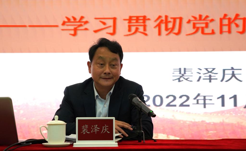 裴泽庆在宣讲中提到,党的二十大是在全党全国各族人民迈上全面建设社会主义现代化国家新征程、向第二个百年奋斗目标进军的关键时刻召开的一次十分重要的大会,是一次高举旗帜、凝聚力量、团结奋进的大会。他从“深刻把握党的二十大的主题和主要成果”“深刻把握过去5年的工作和新时代10年的伟大变革”“深刻把握开辟马克思主义中国化时代化新境界的历史责任”“深刻把握以中国式现代化全面推进中华民族伟大复兴的使命任务”“深刻把握全面建设社会主义现代化国家的目标任务”“深刻把握加强党的全面领导和全面从严治党的部署要求”等方面对党的二十大精神作了全面系统的解读。