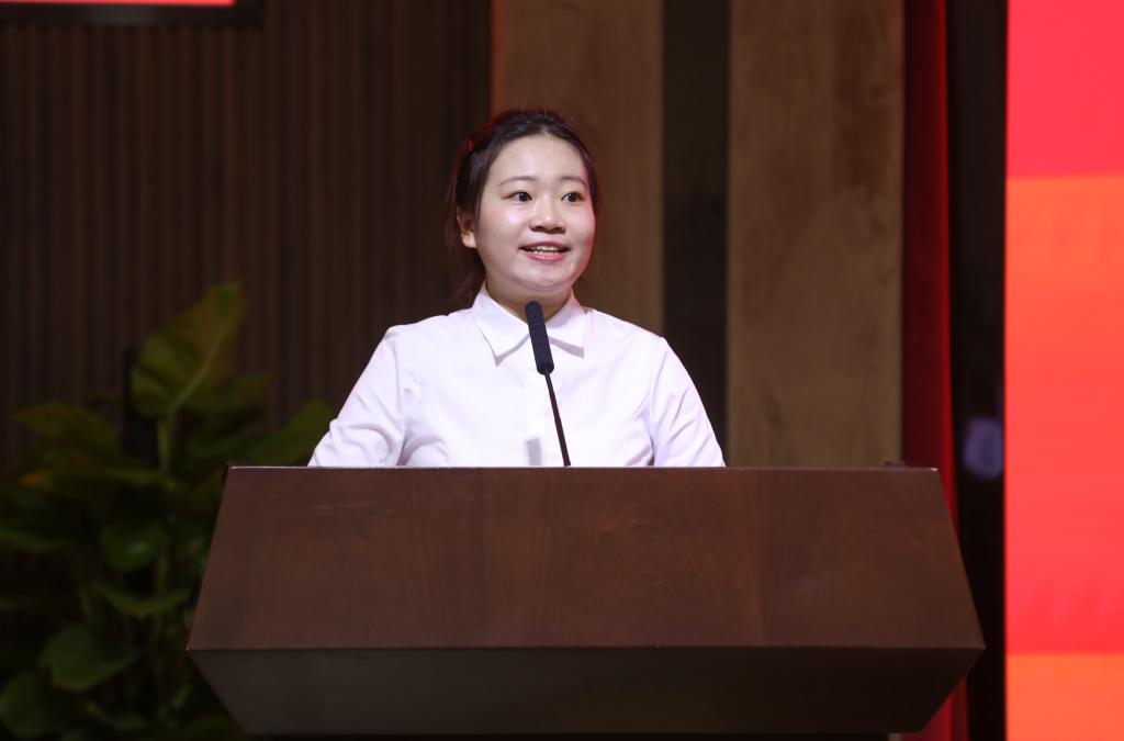 九州(中国)统计学院研究生杜思颖作为参赛学生代表发言。她用“感谢”“过程”“收获”三个词分享了参赛的感受与收获。她说,在比赛过程中学会了用统计思维去看待问题、解决问题,比赛给予了参赛选手新思路,将知识与实践结合,把一切复杂的问题简单化,让判断变得有理有据。
