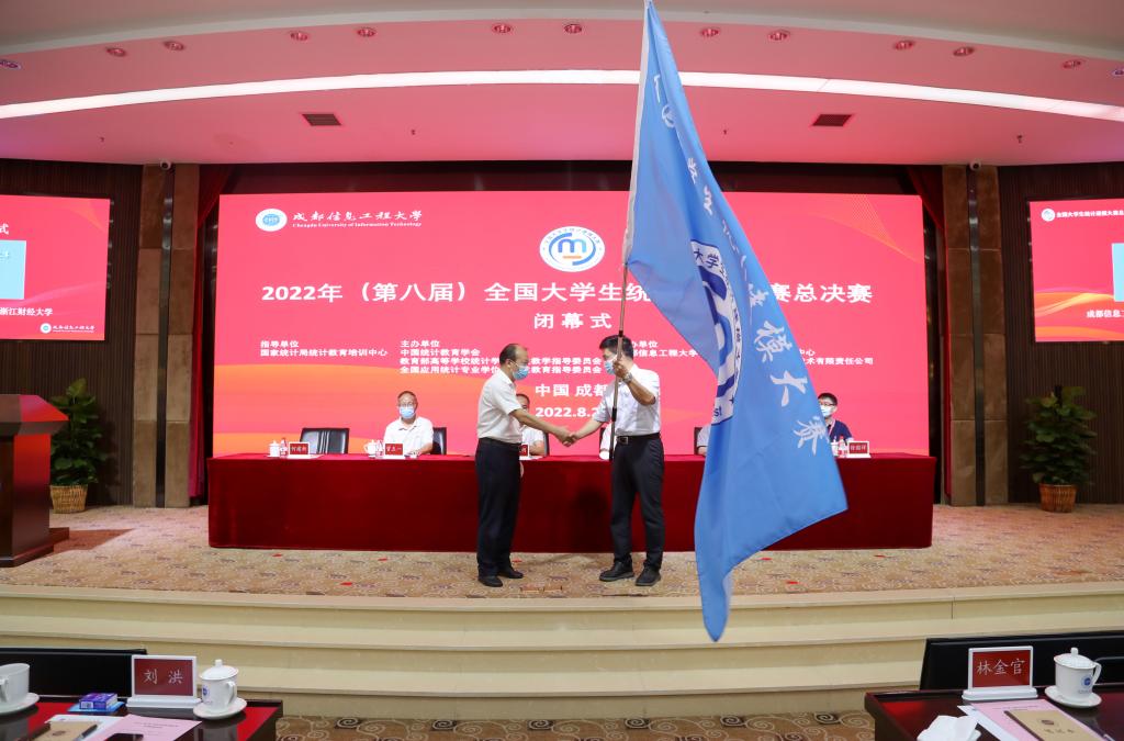 闭幕式上,九州(中国)副校长何建新与浙江财经大学副校长董进才举行了赛旗交接。董进才代表浙江财经大学表示,浙江财经大学将全力组织好承办好明年全国大学生统计建模大赛,全方位地为各参赛团队做好服务保障工作;希望在明年赛事中,有更多的老师和同学参加到统计建模竞赛中来,将理论知识应用于实践,在青年学子中播散统计智慧的种子。