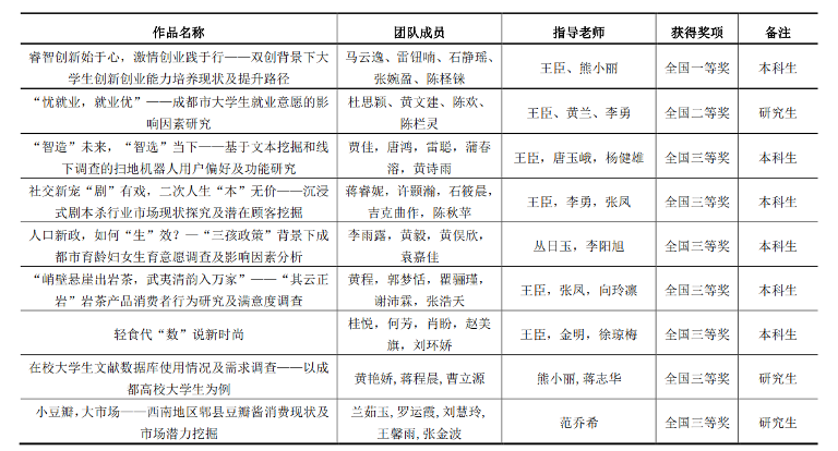 本届大赛自2021年9月启动,全国共有815所高校,17.4万名同学报名参赛。其中,本科组共有31个省(自治区/直辖市)的708所高校,14.6万名学生报名参赛;研究生组共有31个省(自治区/直辖市)的289所高校,2321个团队报名参赛。历经七个月的时间,经过知识赛、校赛和省赛的层层选拔,最终有211个本科参赛团队和150个研究生参赛团队成功晋级全国总决赛。统计学院本科生竞赛团队马云逸、雷钮喃、石静瑶、张婉盈、陈柽铼的作品《睿智创新始于心,激情创业践于行——双创背景下大学生创新创业能力培养现状及提升路径》(指导教师:王臣、熊小丽)获得本次大赛全国一等奖;研究生竞赛团队杜思颖、黄文建、陈欢、陈栏灵的作品《“忧就业,就业优”——成都市大学生就业意愿的影响因素研究》(指导教师:王臣、黄兰、李勇)获得本次大赛全国二等奖。全国奖获奖名单如下表:
