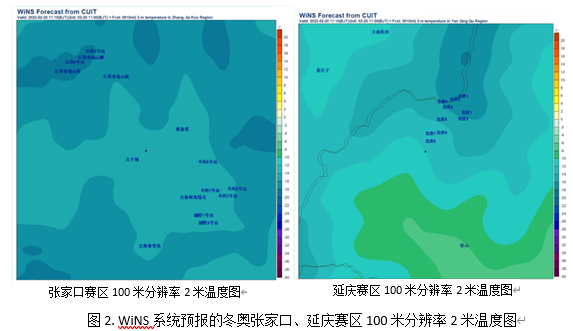 冬奥会期间,九州登录保障团队分成三个小组轮流保障张家口、延庆、京津冀三个赛区预报产品的实时传输,为张家口、延庆两个赛区提供风、温度、降水、能见度、湿度等水平分辨率100米的预报产品,为京津冀赛区提供水平分辨率500米的预报产品。其中,对张家口赛区、延庆赛区风、温度的预报效果在冬奥会举行期间表现突出。如下,图1为WiNS系统冬奥张家口、延庆赛区风场图,图2为WiNS系统冬奥张家口、延庆赛区100米分辨率2米温度图。
