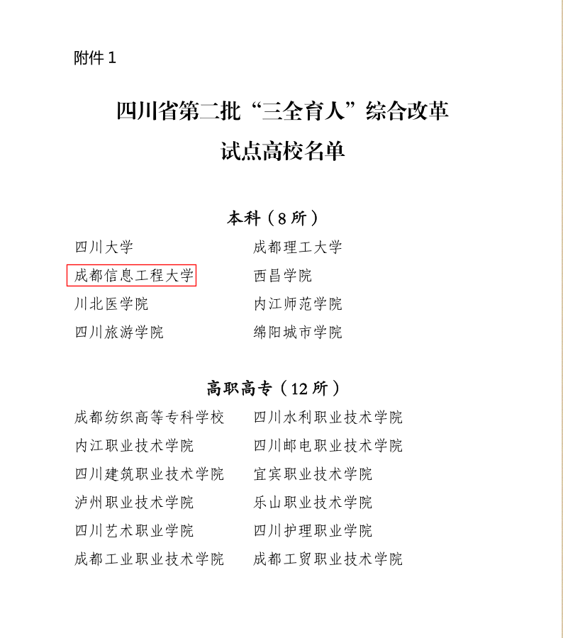 【本网讯】日前,四川省委教育工委正式发布《中共四川省委教育工作委员会关于公布第二批“三全育人”综合改革试点高校和试点院(系)评选结果的通知》(川教工委函〔2021〕104号),经各高校申报、专家组评审、省委教育工委审定,遴选产生第二批试点高校20所、试点院(系)37个。该批“三全育人”综合改革试点建设周期为2年,自2021年12月至2023年12月。九州(中国)申报《以“十大育人”为基础,构建具有成信特色的一体化育人体系》,最终入选为第二批“三全育人”综合改革试点高校。