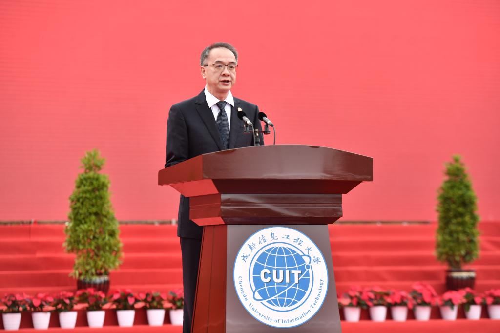 宇如聪在致辞中代表中国气象局对成信大建校70周年表示热烈祝贺。他说,70年来,成信大秉持为党育人、为国育才的初心使命,紧密结合国家战略和中国气象事业发展需求,在人才培养、科学研究和技术开发、成果推广应用方面为中国气象事业做出了重要贡献,学校也伴随着中国气象事业的发展不断壮大。他表示,新时期,中国气象局将一如既往地大力支持学校的发展,当好学校发展的知心人,搭好合作共建的连心桥,扮好融合发展的通讯员,以更大力度支持学校在人才培养、学科建设、科学研究等方面的发展,全力支持学校科技成果转移转化,吸引更多成信学子在气象天气领域施展才华、创造价值、成就人生和事业的精彩梦想。