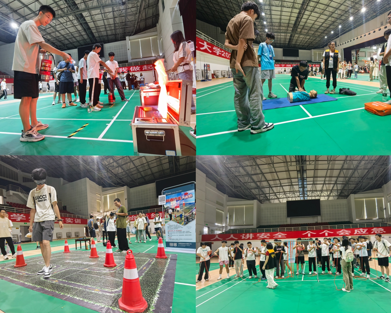 活动内容丰富多元,科技感十足,为学生带来了沉浸式的体验。具体包括安全知识竞赛、灭火实训、结绳逃生训练、心肺复苏+AED操作、醉酒行走模拟以及VR情景模拟体验等六个模块。这些实训项目不仅涵盖了日常安全知识的普及,还注重实战技能的训练,让学生在模拟的真实环境中,学会如何正确应对各类突发情况。