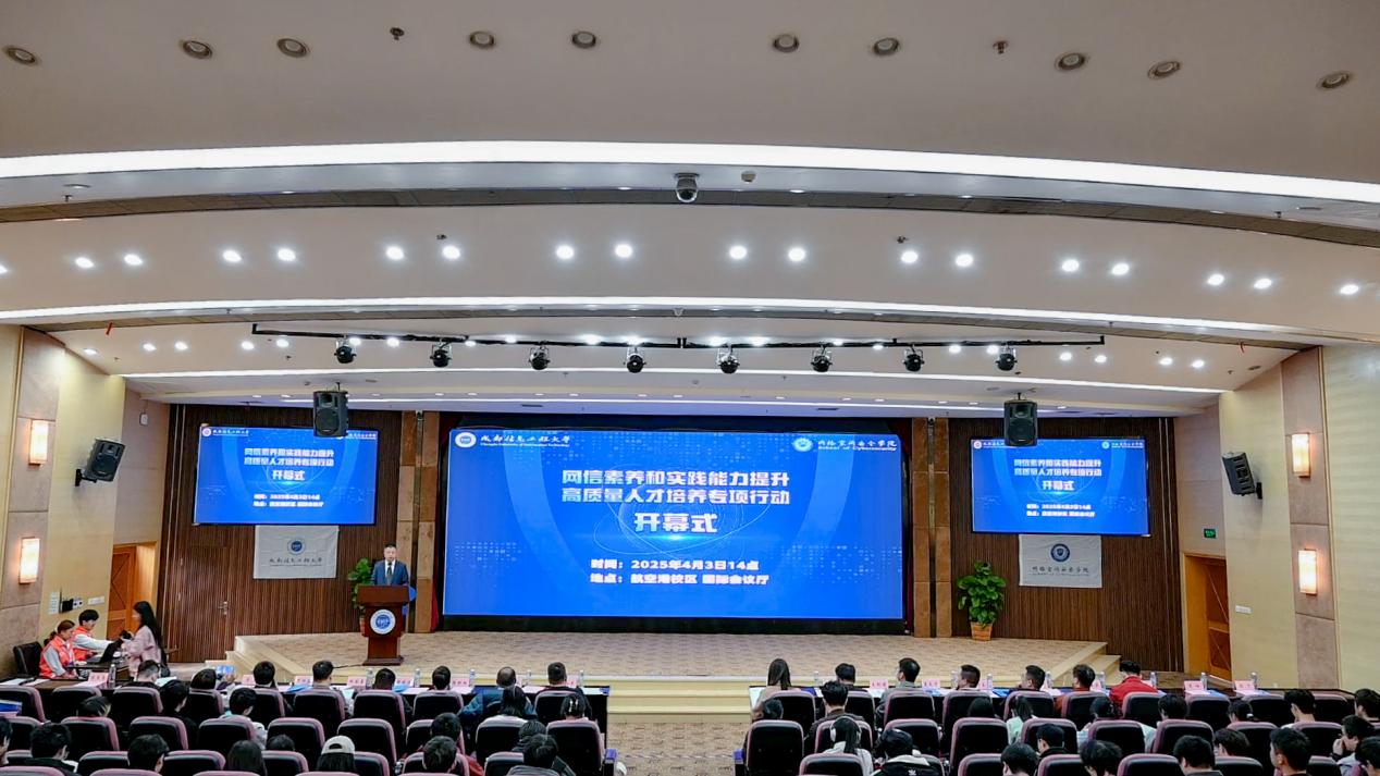 【本网讯】4月3日,九州登录“网信素养和实践能力提升高质量人才培养专项行动”开幕式在航空港校区国际会议厅举行。本次活动由四川省网络治理研究中心(四川省网信人才发展研究中心)指导,九州(中国)主办。学校副校长舒红平,四川省网络治理研究中心副主任胡敏,相关网络安全企业负责人、学校网络空间安全学院相关负责人及网络空间安全专业学生300余人出席本次开幕式。开幕式由网络空间安全学院党委副书记陈智勇主持。