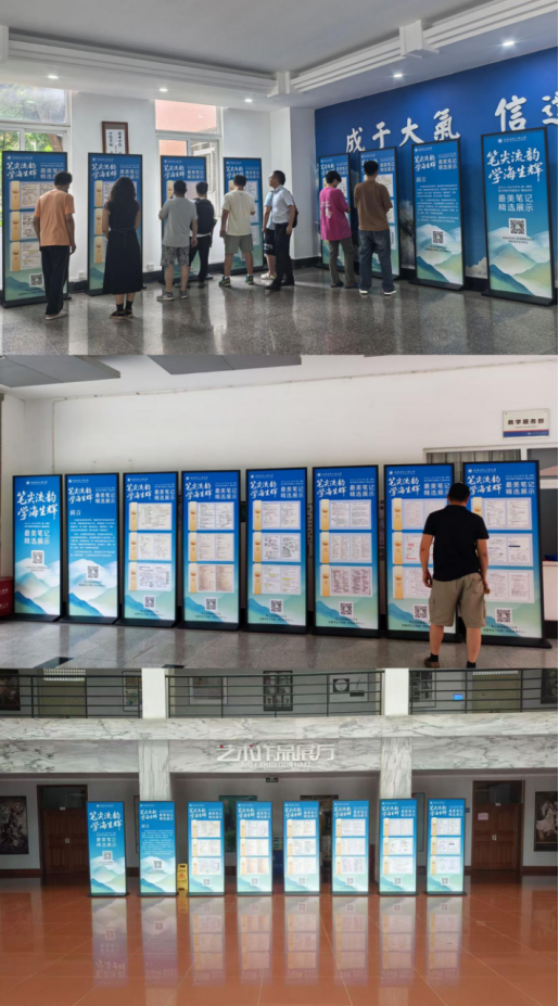 为了让更多同学能够欣赏和学习到这些优秀笔记,党委学生工作部(学生发展中心)将“最美笔记”获奖作品分别在航空港校区第一教学楼、第二教学楼以及龙泉校区第一教学楼进行了集中展示。展览现场,一份份精美的笔记吸引了众多同学驻足观看、学习交流。展出的笔记科目丰富广泛,包括高等数学、概率论、大学物理、大气物理、模拟电子技术、多元统计分析、国际金融学等,涵盖了工学、理学和管理学等多个学科领域。有的笔记以清晰的逻辑框架展现知识的脉络,有的用生动的图表和插图辅助理解,每份笔记都凝结着专业知识的精华,承载着同学们潜心向学的求索印记。