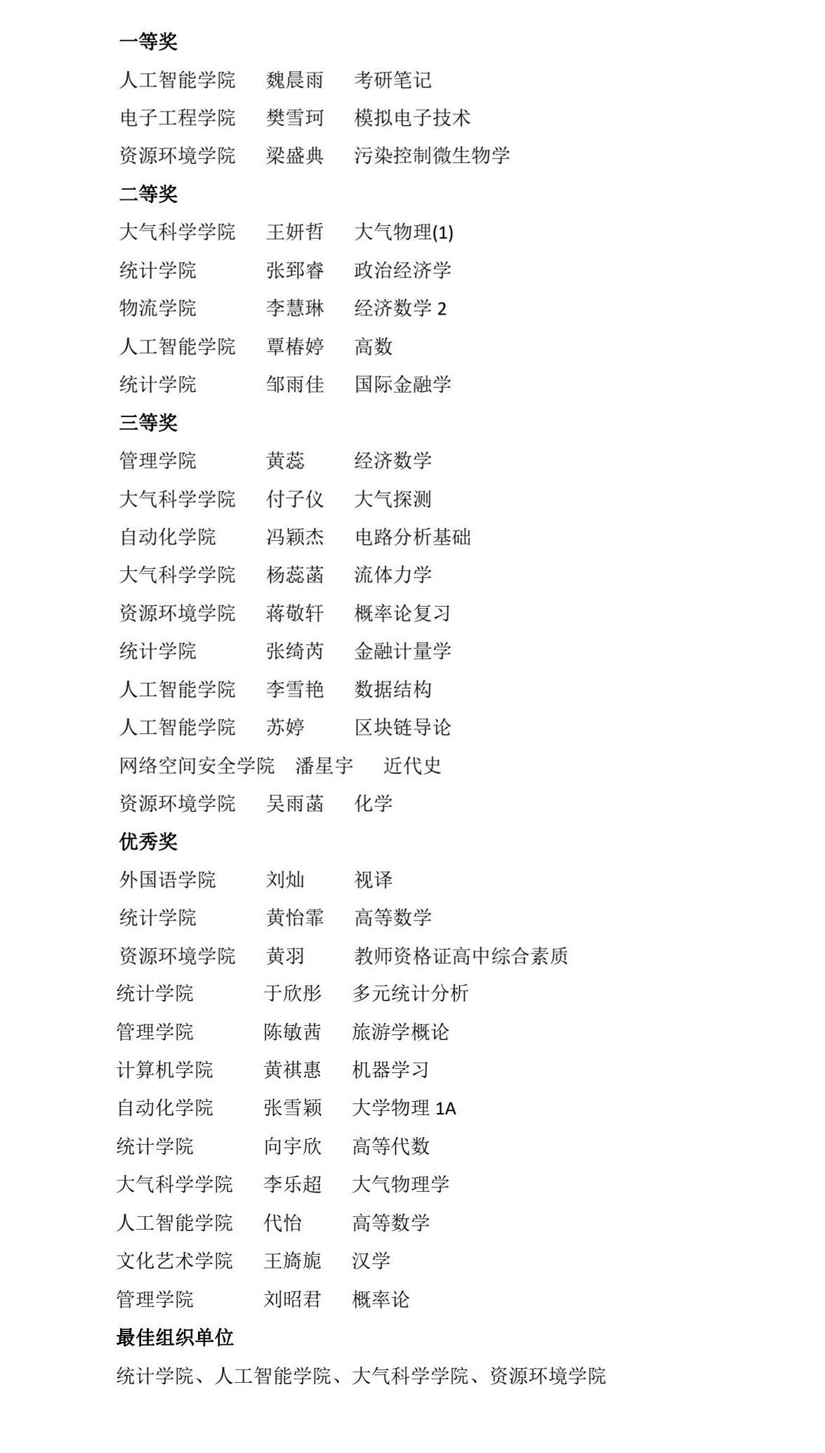 大赛自启动以来,得到了同学们的广泛关注和积极参与,共收到来自16个学院的215份笔记作品,涵盖课程笔记、备考笔记、考研笔记、教师资格证备考笔记等多个领域。评委们从笔记内容的深度、广度与逻辑性,书写与排版,以及创意与美观等多个维度对参赛作品进行了严格评选。最终评选出一等奖3名、二等奖5名、三等奖8名及优秀奖12名。这些获奖作品字迹工整秀丽,条理清晰分明,重点突出醒目,内容详尽充实,不仅体现了同学们扎实的学习功底,更彰显了他们积极向上的学习热情和勇于创新的精神风貌。