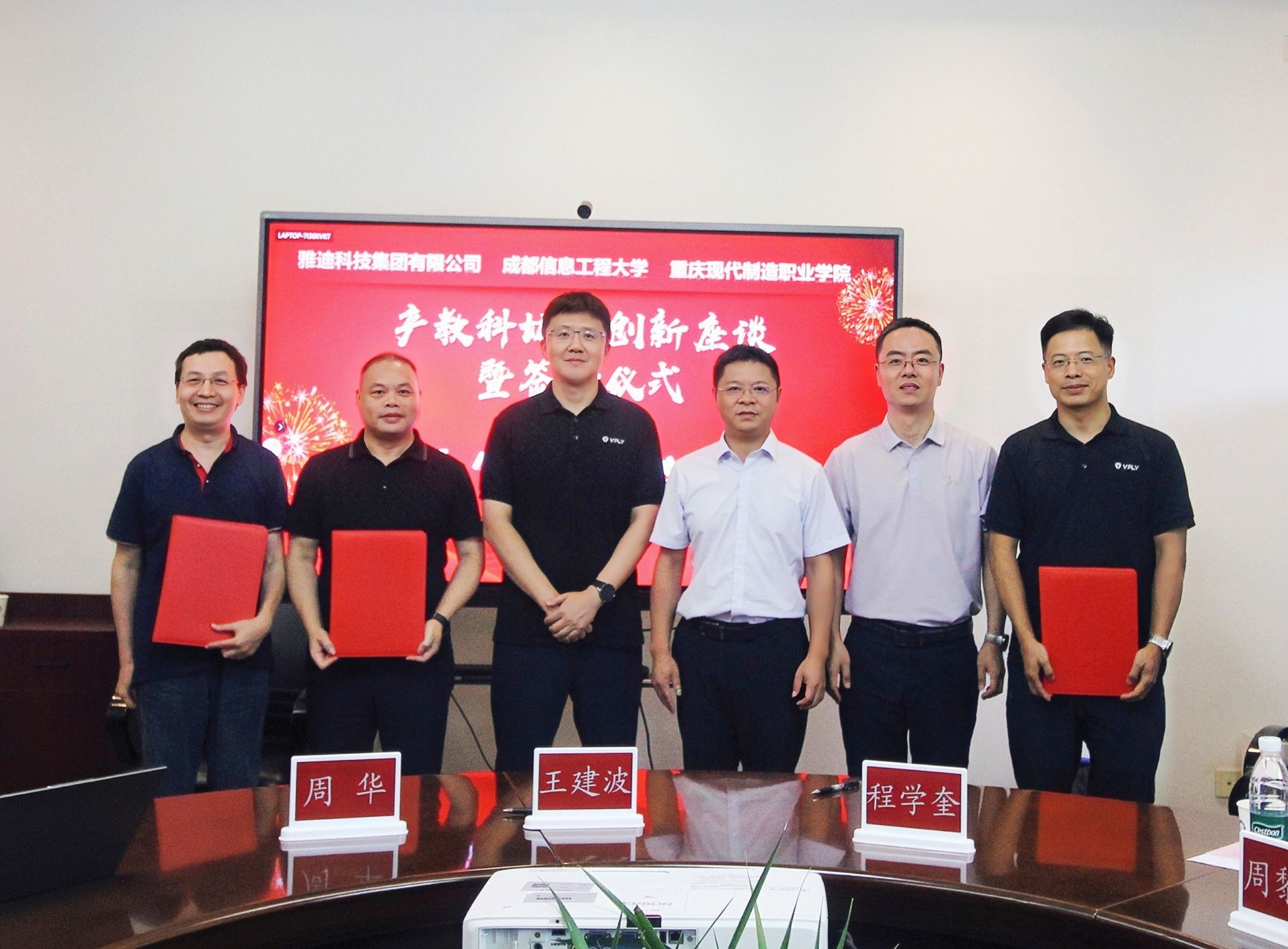 【本网讯】7月11日,雅迪科技集团有限公司、重庆现代制造职业学院一行到访学校,三方举行交流座谈会并正式签署产教科协同合作协议。雅迪科技集团全球人力总监、重庆现代制造职业学院理事长贺剑,雅迪科技集团大数据中心总监程学奎,雅迪重庆制造公司副总经理、重庆现代制造职业学院副校长周华,学校副校长何晋等参加会议。座谈会由学校创新创业学院副院长周启忠主持,程学奎、王建波、周华分别代表三方签约。