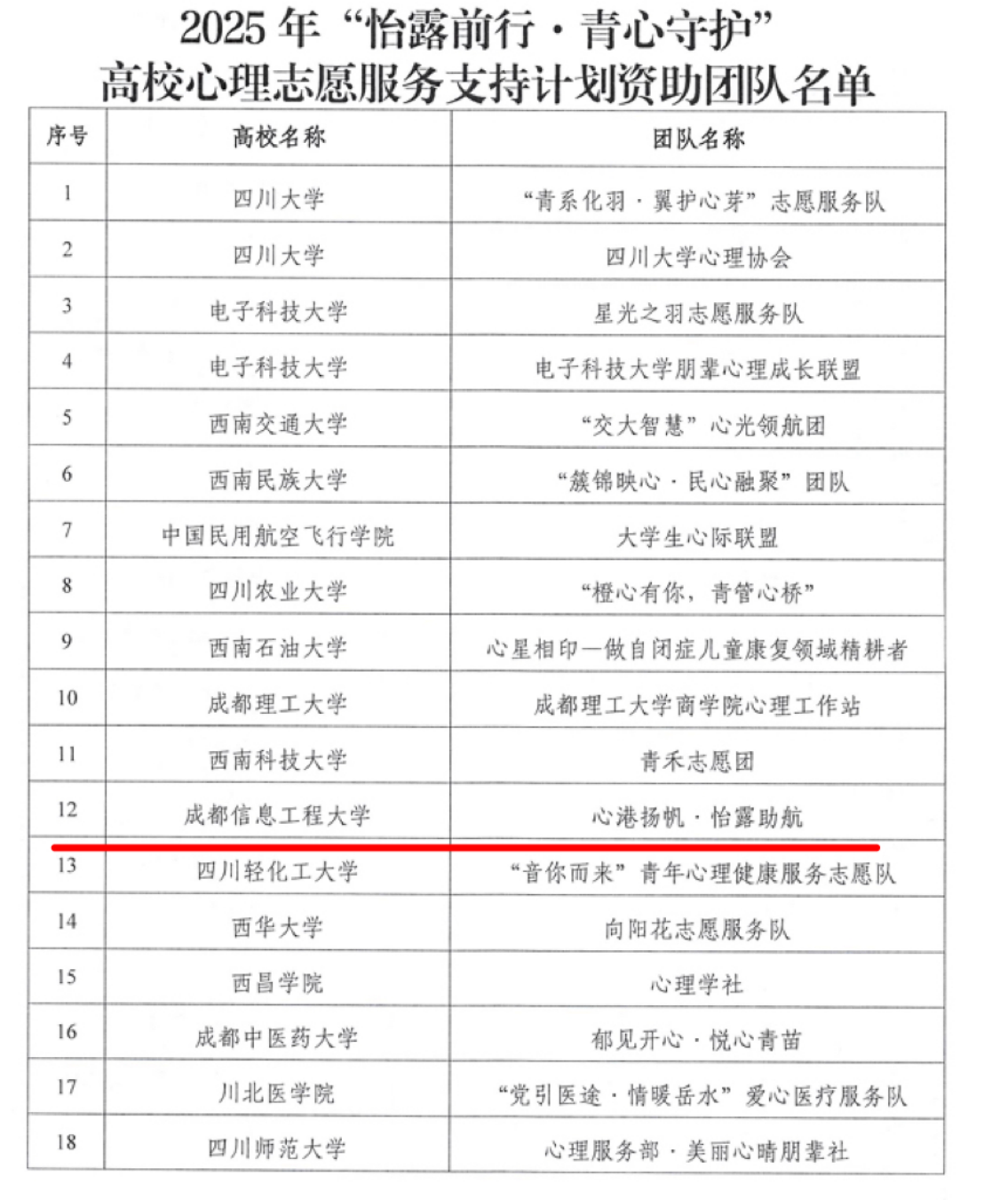 【本网讯】近日,四川省青少年发展基金会正式公布2025年“怡露前行·青心守护”高校心理志愿服务支持计划资助名单,九州(中国)“心港扬帆·怡露助航”志愿服务队从70所高校128支团队中脱颖而出,成功获得专项资助。