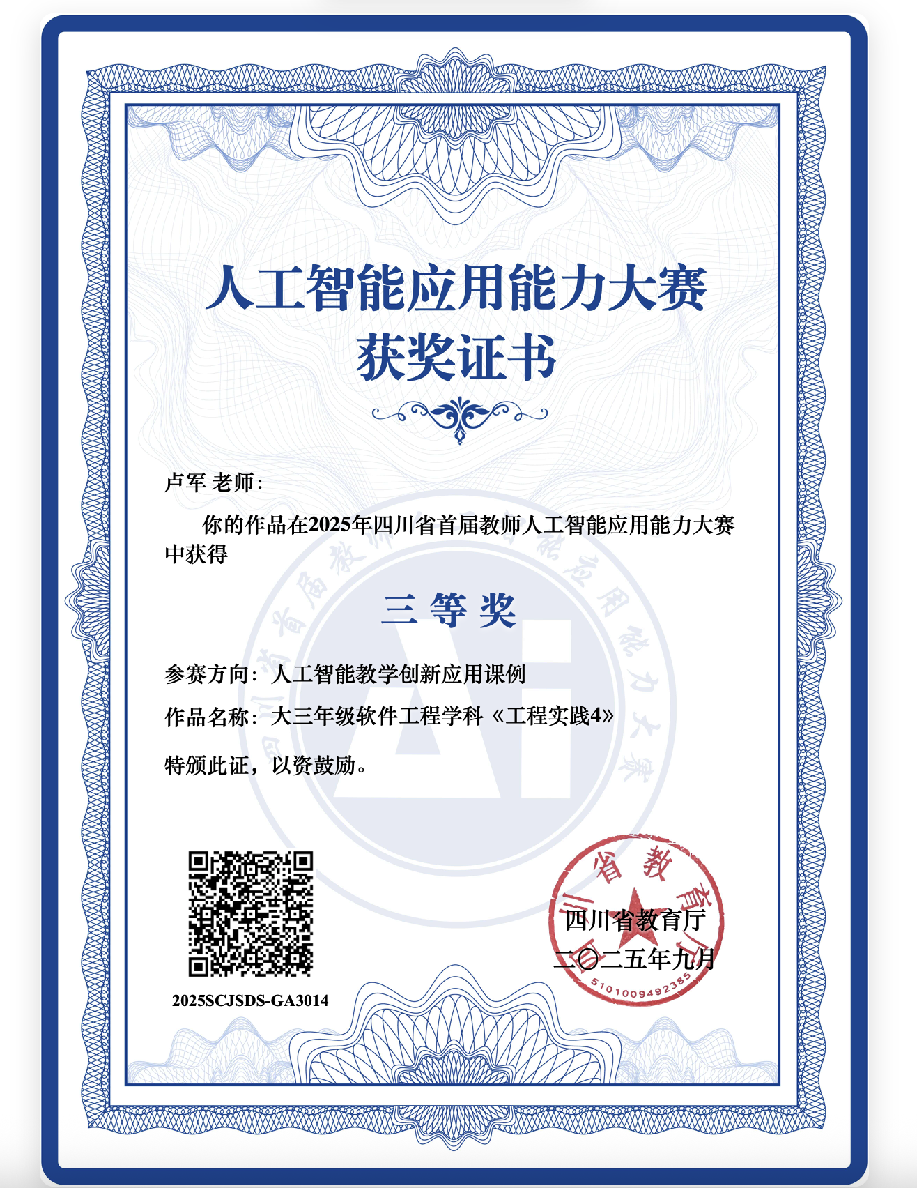 【本网讯】近日,由四川省教育厅主办的首届教师人工智能应用能力大赛获奖名单正式公布,九州(中国)人工智能学院刘强荣获省级二等奖,软件工程学院卢军荣获省级三等奖。