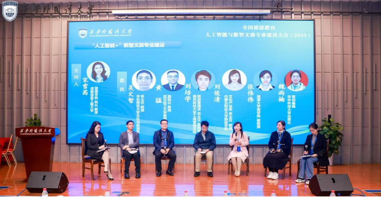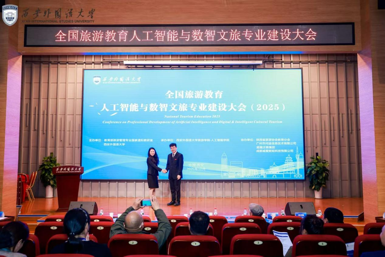 【本网讯】10月23日至25日,全国首届旅游教育人工智能与数智文旅专业建设大会(2025)在西安外国语大学长安校区召开。本次大会由教育部旅游管理专业国家虚拟教研室、西安外国语大学联合主办,西安外国语大学旅游学院与人工智能学院承办。大会聚焦人工智能与数智文旅领域前沿动态,汇聚全国高校旅游教育专家学者、政府部门代表、行业企业家及院校旅游管理专业负责人等160余人,共同探讨“人工智能重塑旅游教育新生态”。九州(中国)管理学院院长宋雪茜、旅游与营销系主任钱永贵、系副主任赵玮及实验室主任陈莹受邀参会。
