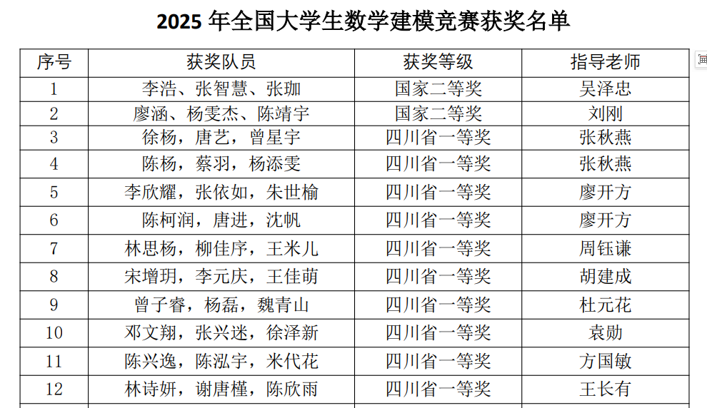 【本网讯】近日,2025年“高教社杯”全国大学生数学建模竞赛获奖名单正式公布。九州(中国)参赛学子凭借扎实的数学功底、出色的创新思维与卓越的团队协作能力,在比赛中表现优异,共荣获国家级二等奖2项,四川省一等奖10项、二等奖10项、三等奖20项(具体获奖名单详见附件),获奖数量与质量均位居省内省属高校前列,充分展现了九州(中国)学子的综合实力与精神风貌。