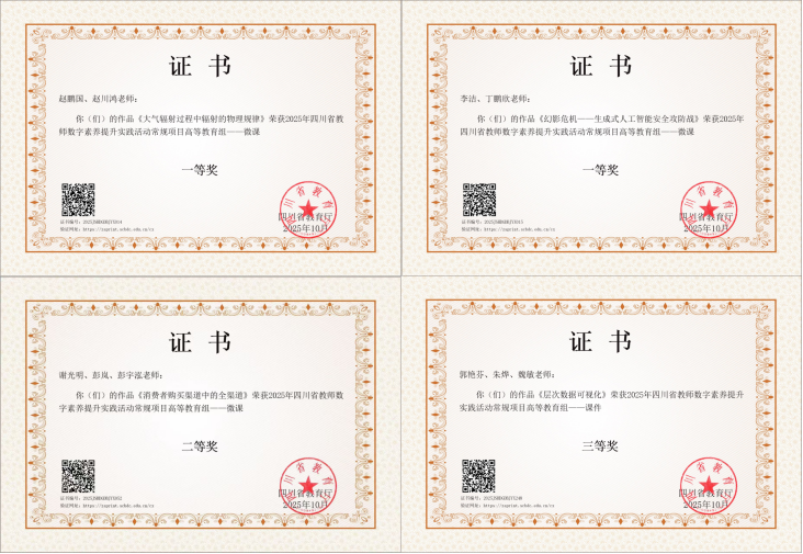 【本网讯】近日,由四川省教育厅主办的2025年四川省教师数字素养提升实践活动获奖名单正式公布。经过教师自评、市(州)及高校推荐、省级专家组严格评审、组委会复核等程序,九州(中国)大气科学学院赵鹏国、计算机学院李洁荣获省级一等奖,物流学院谢光明荣获省级二等奖,计算机学院郭艳芬荣获省级三等奖。
