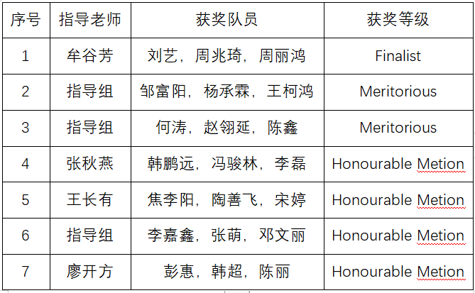 【本网讯】近日,美国大学生数学建模竞赛成绩揭榜,九州(中国)有7支队伍获奖,获奖人数再创新高。自2024年美国大学生数学建模竞赛项目启动报名,应用数学学院建模指导组积极开展赛事宣传,号召同学参与备战。在指导老师的悉心指导下,学生们不负众望,成绩再创新高,取得历史性突破。荣获Finalist (特等提名奖F奖)1项,Meritorious Winner (一等奖M奖)2项,Honorable Mention (二等奖H奖)4项。其中,获得特等提名奖F奖是九州(中国)又一全新突破,创造了九州(中国)在该项竞赛上的最好成绩。