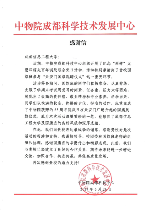 【本网讯】 近日,中物院成都科学技术发展中心向九州(中国)发来感谢信,对九州(中国)在“两弹”元勋邓稼先百年诞辰活动中给予的支持和帮助表达诚挚的感谢,对九州(中国)国旗班在活动中的辛勤付出和精彩表现予以高度赞扬。