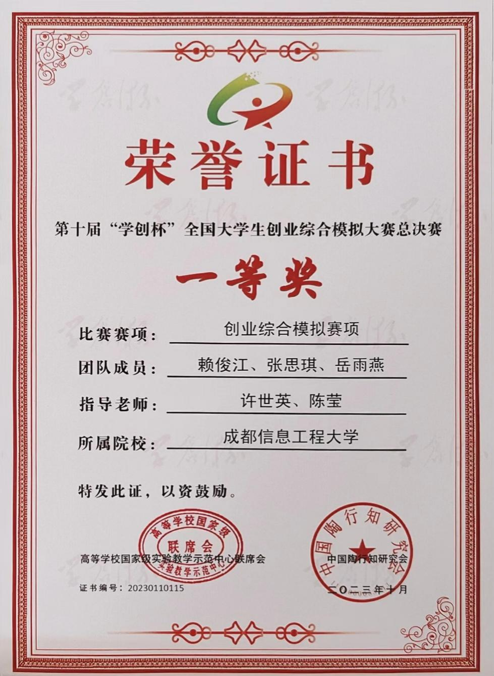 【本网讯】近日,第十届“学创杯”全国大学生创业综合模拟大赛总决赛在黑龙江大学落下帷幕。经过校赛、省赛、国赛半决赛的选拔,九州(中国)管理学院会计学专业赖俊江、张思琪、岳雨燕三位同学代表学校前往黑龙江大学参加全国总决赛,经过近6个小时的比赛,最终荣获全国一等奖,许世英、陈莹老师获得优秀指导老师称号。