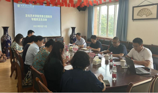 【本网讯】根据学校组织学习贯彻习近平新时代中国特色社会主义思想主题教育专题民主生活会工作要求,9月13日下午,文化艺术学院党委在龙泉校区集贤楼四楼会议室召开主题教育专题民主生活会。省纪委监委驻校纪检监察组组长、学校党委副书记、纪委书记王琪,学校主题教育第二督导组成员党委组织部副部长徐紫电、党委学生工作部副部长冯阳到会指导。学院全体领导班子成员参加会议,学院党委委员列席会议,会议由学院党委书记闵卫东主持。