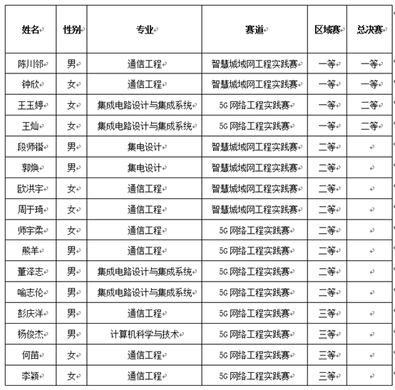 本届大赛由通信工程学院(微电子学院)负责校内培训和选拔,共吸引了通信工程、集成电路设计与集成系统、计算机科学与技术等多个专业的学生报名参赛。在2023年8月11日举行的西部赛中,九州(中国)参赛团队表现不俗,斩获赛区一等奖2项、二等奖4项和三等奖2项,最终由九州(中国)通信工程专业21级的陈川邻、钟欣团队和集成电路设计与集成系统专业21级的王灿、王玉婷团队代表学校参加了全国总决赛并分别获得大赛“智慧城域网工程实践赛”赛道全国一等奖和“5G网络工程实践赛”赛道全国二等奖。