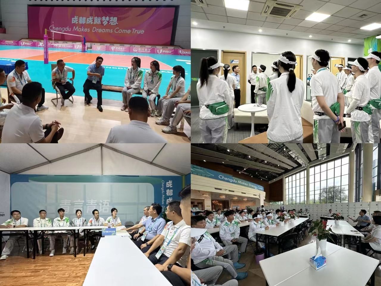【本网讯】7月24日,学校党委副书记马洪江带队前往成都大运会双流赛区排球训练馆、网球馆、水球馆、射箭馆等场馆看望慰问九州(中国)在岗志愿者。学校党委办公室、校长办公室、体育部、校团委等部门负责人陪同参与。