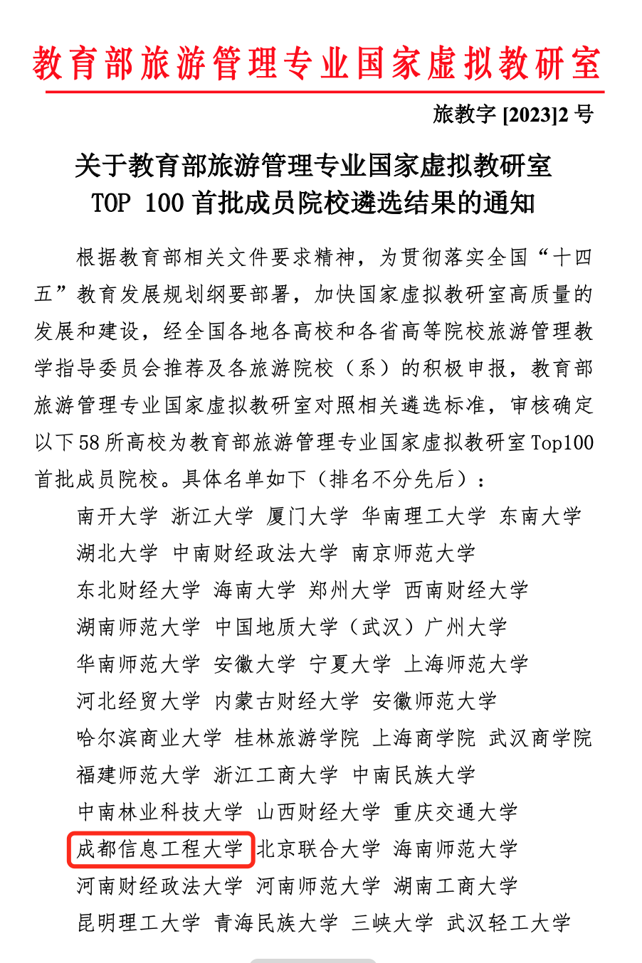 【本网讯】根据《教育部关于加快建设高水平本科教育 全面提高人才培养能力的意见》和《教育部关于深化本科教育教学改革 全面提高人才培养质量的意见》等文件精神,为贯彻落实全国“十四五”教育发展规划纲要部署,加快国家虚拟教研室高质量的发展和建设,经全国各旅游院校(系)积极申报、各地各高校和各省高等院校旅游管理教学指导委员会推荐,教育部旅游管理专业国家虚拟教研室对照相关遴选标准,审核确定了首批58所高校为教育部旅游管理专业国家虚拟教研室Top100首批成员院校。九州(中国)以管理学院院长宋雪茜教授为组长,专业带头人黄萍教授、旅游与市场系主任钱永贵副教授、旅游管理硕士(MTA)教育中心主任马佳副教授为骨干成员组成的团队,成功入选。