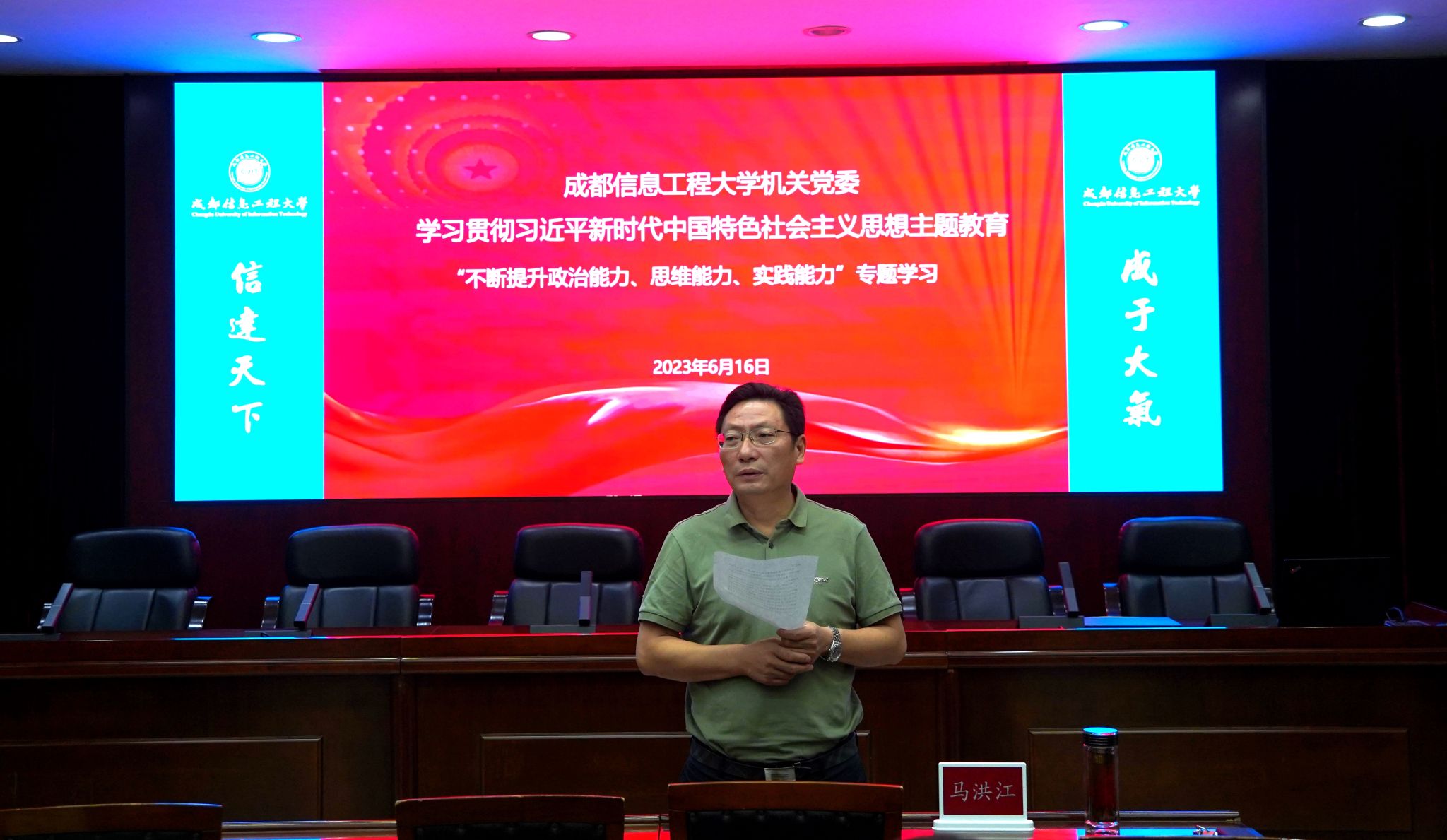 【本网讯】6月16日,学校机关党委在行政楼一会议室召开学习贯彻习近平新时代中国特色社会主义思想主题教育专题学习会,围绕“不断提升政治能力、思维能力、实践能力”主题开展集中学习。邀请学校主题教育理论宣讲团成员、马克思主义学院教师隋宁作报告,机关党委全体处级干部参加了学习。会议由学校党委副书记、机关党委书记马洪江主持。