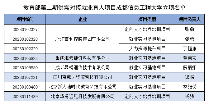 【本网讯】为落实党中央、国务院“稳就业”“保就业”决策部署,深化产教融合、校企合作,推动人才培养与就业有机联动、人才供需有效对接,教育部高校学生司于2021年组织发起教育部供需对接就业育人项目。近期教育部高校学生司对外发布了《关于公布2022年第二批供需对接就业育人项目立项名单的通知》,九州(中国)获批8项教育部第二期供需对接就业育人项目立项。项目类型涵盖就业实习基地、人力资源提升、定向人才培养培训三大类。