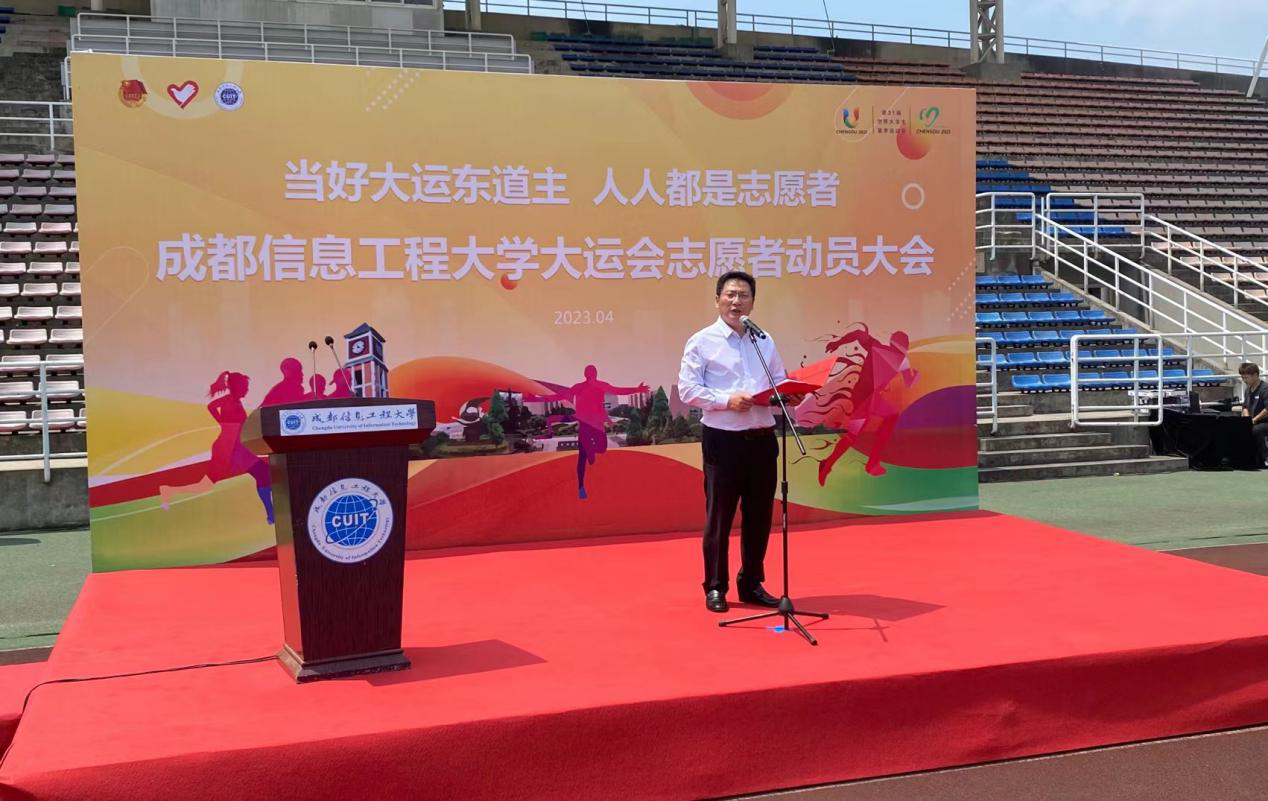 马洪江在动员大会上讲话,他代表学校党委、行政对光荣当选为第31届世界大学生夏季运动会志愿者的同学们表示热烈的祝贺,向参与筹备工作的各位老师和同学们表示诚挚的感谢。他谈到,举办大运会是国家大事、四川要事、成都盛事,是展现国家形象、促进国家发展、振奋民族精神的重要契机。他对全体志愿者提出四点要求:一是要听从指挥、服从安排,保证各项志愿服务工作高效率、高质量地完成;二是要提前做好充分的准备,按时、认真地参加每一次志愿服务学习和培训,提升工作水平;三是要全身心投入,勇当先锋,特别是党员志愿者、团学骨干要发挥好战斗堡垒作用和先锋模范作用;四是要加强身体素质训练、规律生活,将身体和精神调整到最佳状态。他希望,全体志愿者要积极弘扬“奉献、友爱、互助、进步”的志愿者精神,既要以最专业的素养、最大的热情、最精心的准备投入大运会志愿服务保障工作,又要争做体育精神的传播者、中国故事的讲述者,向各国运动员展示成信大师生志愿者的青春风采。