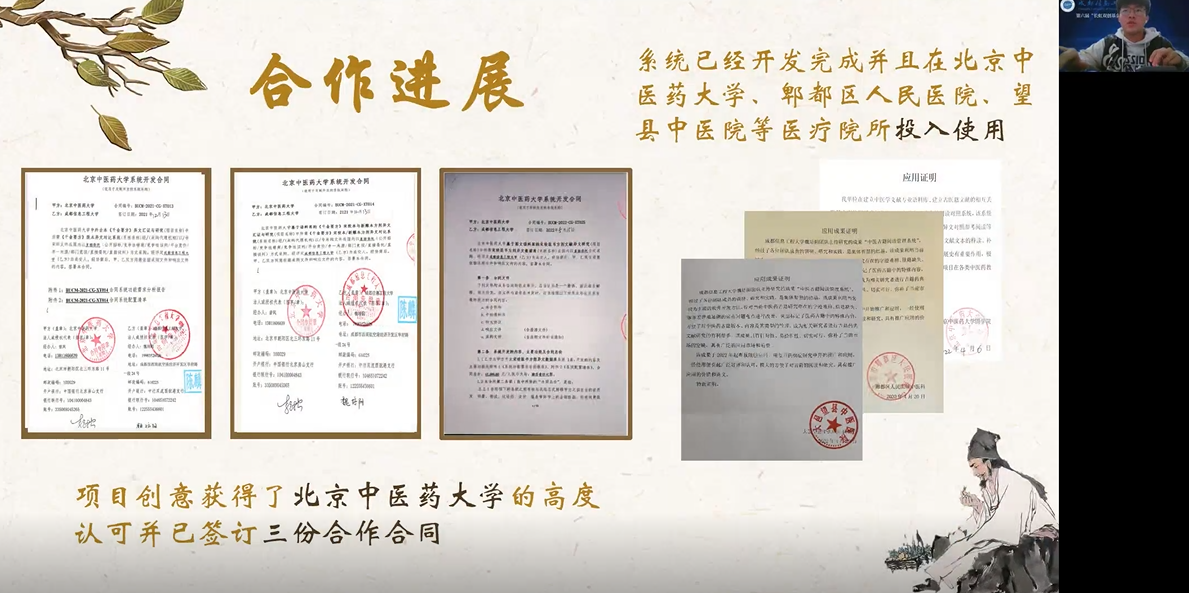 此次评选活动最精彩的环节当属12月15日下午举行的线上评审答辩会。由学校教育基金会、党委学生工作部、教务处、研究生处、科技处、校团委负责人;九州登录四川校友会副会长、九州登录企业家联谊会秘书长、成都德津科技有限公司董事长楚辉东;学校本科教学指导委员会创新创业教育分委会专家代表;大学生创新开放实验室主任代表组成的评审专家组,通过线上形式,对候选团队(个人)的创新创业项目进行了评审。