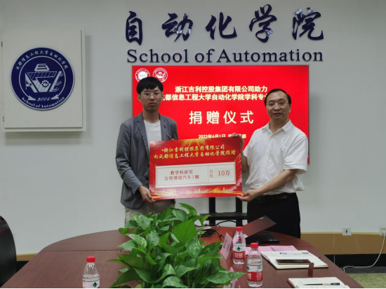 余琪、张葛祥代表双方举行了捐赠授牌仪式,浙江吉利控股集团向自动化学院捐赠了一辆吉利博瑞汽车作为教学科研用车。
